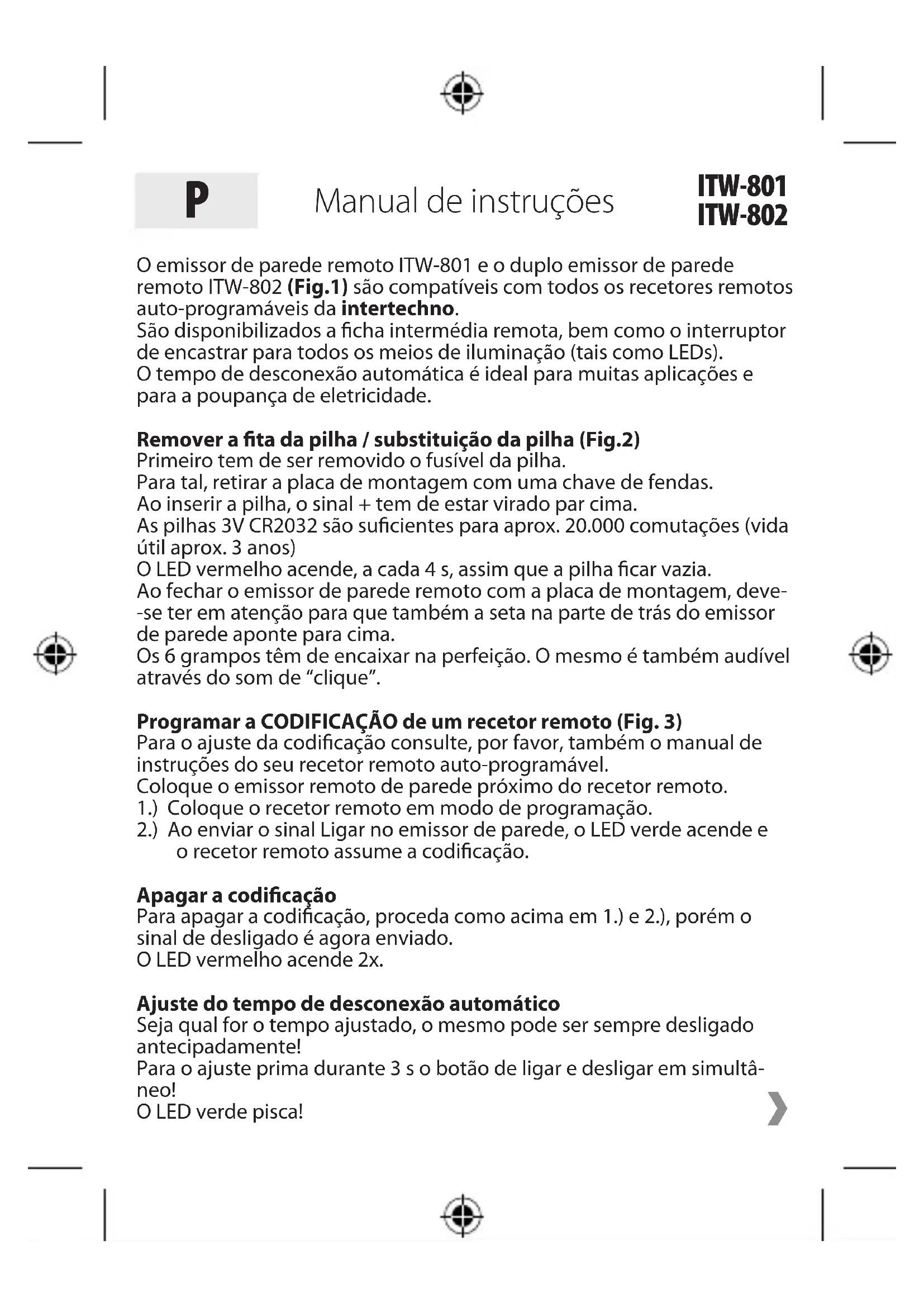 ITW-801 ITW-802O emissor de parede remoto ITW-801 e o duplo emissor de parede remoto ITW-802 (Fig.1) são compatíveis com todos os recetores remotos auto-programáveis da intertechno. São disponibilizados a ficha intermédia remota, bem como o interruptor de encastrar para todos os meios de iluminação (tais como LEDs). O tempo de desconexão automática é ideal para muitas aplicações e para a poupança de eletricidade. Remover a fita da pilha / substituição da pilha (Fig.2) Primeiro tem de ser removido o fusível da pilha. Para tal, retirar a placa de montagem com uma chave de fendas. Ao inserir a pilha, o sinal + tem de estar virado par cima. As pilhas 3V CR2032 são suficientes para aprox. 20.000 comutações (vida útil aprox. 3 anos) O LED vermelho acende, a cada 4 s, assim que a pilha ficar vazia. Ao fechar o emissor de parede remoto com a placa de montagem, deve- -se ter em atenção para que também a seta na parte de trás do emissor de parede aponte para cima. Os 6 grampos têm de encaixar na perfeição. O mesmo é também audível através do som de “clique”. Programar a CODIFICAÇÃO de um recetor remoto (Fig. 3) Para o ajuste da codificação consulte, por favor, também o manual de instruções do seu recetor remoto auto-programável. Coloque o emissor remoto de parede próximo do recetor remoto. 1.) Coloque o recetor remoto em modo de programação. 2.) Ao enviar o sinal Ligar no emissor de parede, o LED verde acende e o recetor remoto assume a codificação. Apagar a codificação Para apagar a codificação, proceda como acima em 1.) e 2.), porém o sinal de desligado é agora enviado. O LED vermelho acende 2x. Ajuste do tempo de desconexão automático Seja qual for o tempo ajustado, o mesmo pode ser sempre desligado antecipadamente! Para o ajuste prima durante 3 s o botão de ligar e desligar em simultâ- neo! O LED verde pisca!