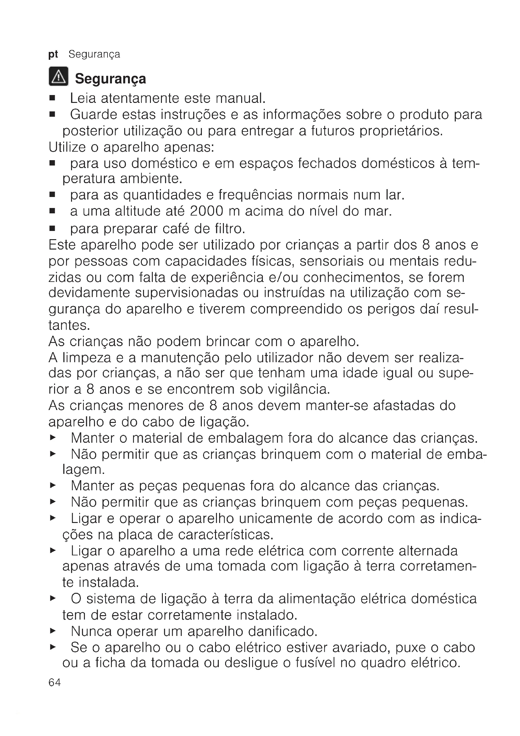 Segurança ¡ Leia atentamente este manual. ¡ Guarde estas instruções e as informações sobre o produto para posterior utilização ou para entregar a futuros proprietários. Utilize o aparelho apenas: ¡ para uso doméstico e em espaços fechados domésticos à tem- peratura ambiente. ¡ para as quantidades e frequências normais num lar. ¡ a uma altitude até 2000m acima do nível do mar. ¡ para preparar café de filtro. Este aparelho pode ser utilizado por crianças a partir dos 8 anos e por pessoas com capacidades físicas, sensoriais ou mentais redu- zidas ou com falta de experiência e/ou conhecimentos, se forem devidamente supervisionadas ou instruídas na utilização com se- gurança do aparelho e tiverem compreendido os perigos daí resul- tantes. As crianças não podem brincar com o aparelho. A limpeza e a manutenção pelo utilizador não devem ser realiza- das por crianças, a não ser que tenham uma idade igual ou supe- rior a 8 anos e se encontrem sob vigilância. As crianças menores de 8 anos devem manter-se afastadas do aparelho e do cabo de ligação. ▶ Manter o material de embalagem fora do alcance das crianças. ▶ Não permitir que as crianças brinquem com o material de emba- lagem. ▶ Manter as peças pequenas fora do alcance das crianças. ▶ Não permitir que as crianças brinquem com peças pequenas. ▶ Ligar e operar o aparelho unicamente de acordo com as indica- ções na placa de características. ▶ Ligar o aparelho a uma rede elétrica com corrente alternada apenas através de uma tomada com ligação à terra corretamen- te instalada. ▶ O sistema de ligação à terra da alimentação elétrica doméstica tem de estar corretamente instalado. ▶ Nunca operar um aparelho danificado. ▶ Se o aparelho ou o cabo elétrico estiver avariado, puxe o cabo ou a ficha da tomada ou desligue o fusível no quadro elétrico.Evitar danos materiais pt