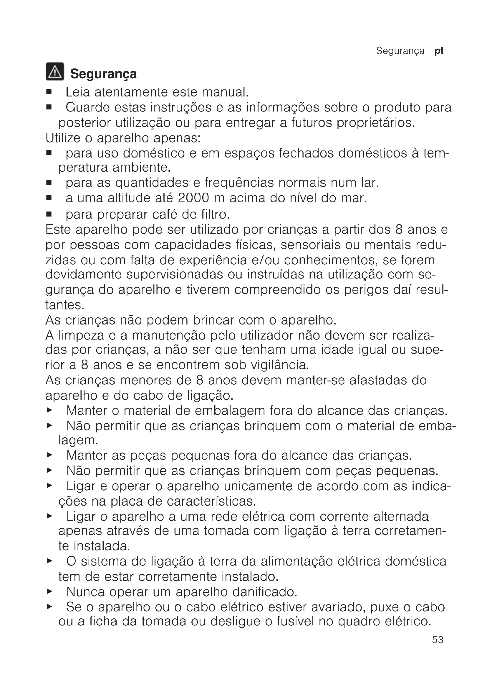 Segurança ¡ Leia atentamente este manual. ¡ Guarde estas instruções e as informações sobre o produto para posterior utilização ou para entregar a futuros proprietários. Utilize o aparelho apenas: ¡ para uso doméstico e em espaços fechados domésticos à tem- peratura ambiente. ¡ para as quantidades e frequências normais num lar. ¡ a uma altitude até 2000m acima do nível do mar. ¡ para preparar café de filtro. Este aparelho pode ser utilizado por crianças a partir dos 8 anos e por pessoas com capacidades físicas, sensoriais ou mentais redu- zidas ou com falta de experiência e/ou conhecimentos, se forem devidamente supervisionadas ou instruídas na utilização com se- gurança do aparelho e tiverem compreendido os perigos daí resul- tantes. As crianças não podem brincar com o aparelho. A limpeza e a manutenção pelo utilizador não devem ser realiza- das por crianças, a não ser que tenham uma idade igual ou supe- rior a 8 anos e se encontrem sob vigilância. As crianças menores de 8 anos devem manter-se afastadas do aparelho e do cabo de ligação. ▶ Manter o material de embalagem fora do alcance das crianças. ▶ Não permitir que as crianças brinquem com o material de emba- lagem. ▶ Manter as peças pequenas fora do alcance das crianças. ▶ Não permitir que as crianças brinquem com peças pequenas. ▶ Ligar e operar o aparelho unicamente de acordo com as indica- ções na placa de características. ▶ Ligar o aparelho a uma rede elétrica com corrente alternada apenas através de uma tomada com ligação à terra corretamen- te instalada. ▶ O sistema de ligação à terra da alimentação elétrica doméstica tem de estar corretamente instalado. ▶ Nunca operar um aparelho danificado. ▶ Se o aparelho ou o cabo elétrico estiver avariado, puxe o cabo ou a ficha da tomada ou desligue o fusível no quadro elétrico.pt Evitar danos materiais