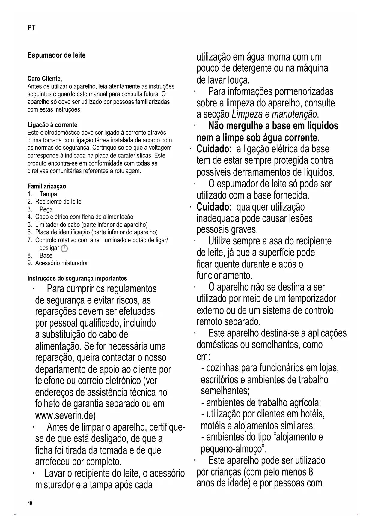 Instruções de segurança importantes ∙ Para cumprir os regulamentos de segurança e evitar riscos, as reparações devem ser efetuadas por pessoal qualicado, incluindo a substituição do cabo de alimentação. Se for necessária uma reparação, queira contactar o nosso departamento de apoio ao cliente por telefone ou correio eletrónico (ver endereços de assistência técnica no folheto de garantia separado ou em www.severin.de). ∙ Antes de limpar o aparelho, certique- se de que está desligado, de que a cha foi tirada da tomada e de que arrefeceu por completo. ∙ Lavar o recipiente do leite, o acessório misturador e a tampa após cada utilização em água morna com um pouco de detergente ou na máquina de lavar louça. ∙ Para informações pormenorizadas sobre a limpeza do aparelho, consulte a secção Limpeza e manutenção. ∙ Não mergulhe a base em líquidos nem a limpe sob água corrente. ∙ Cuidado: a ligação elétrica da base tem de estar sempre protegida contra possíveis derramamentos de líquidos. ∙ O espumador de leite só pode ser utilizado com a base fornecida. ∙ Cuidado: qualquer utilização inadequada pode causar lesões pessoais graves. ∙ Utilize sempre a asa do recipiente de leite, já que a superfície pode car quente durante e após o funcionamento. ∙ O aparelho não se destina a ser utilizado por meio de um temporizador externo ou de um sistema de controlo remoto separado. ∙ Este aparelho destina-se a aplicações domésticas ou semelhantes, como em: - cozinhas para funcionários em lojas, escritórios e ambientes de trabalho semelhantes; - ambientes de trabalho agrícola; - utilização por clientes em hotéis, motéis e alojamentos similares; - ambientes do tipo “alojamento e pequeno-almoço”. ∙ Este aparelho pode ser utilizado por crianças (com pelo menos 8 anos de idade) e por pessoas com PT41 142 x 208 mm capacidades físicas, sensoriais ou mentais reduzidas ou que careçam de experiência e conhecimento, desde que sejam supervisionadas ou recebam instruções sobre a utilização do aparelho e compreendam plenamente todos os perigos e precauções de segurança envolvidos. ∙ As crianças devem ser vigiadas para assegurar que não brinquem com o aparelho. ∙ Não deve permitir que as tarefas de limpeza e manutenção sejam efetuadas por crianças, a menos que estas sejam supervisionadas e tenham pelo menos 8 anos de idade. ∙ O aparelho e o seu cabo de alimentação elétrica devem estar sempre fora do alcance das crianças com menos de 8 anos de idade. ∙ Cuidado: mantenha quaisquer materiais de embalagem bem afastados das crianças; existe risco de asxia. ∙ Sempre que utilizar o aparelho, examine meticulosamente o corpo principal, incluindo o cabo de alimentação elétrica e qualquer acessório aplicado, em busca de possíveis falhas. Se, por exemplo, o aparelho tiver caído sobre uma superfície dura ou o seu cabo de alimentação elétrica tiver sido puxado com força excessiva, não deve continuar a utilizá-lo: até mesmo os danos invisíveis podem ter efeitos adversos sobre a segurança de funcionamento do aparelho. ∙ Não deixe o espumador de leite desacompanhado quando em funcionamento. ∙ Em cada utilização, tenha sempre em atenção as marcas de nível min e max no interior do recipiente. Se não contiver leite suciente, o aparelho pode sobreaquecer. ∙ A saliência no fundo do recipiente (marca de nível min) tem de estar coberta pelo leite. Se não contiver leite suciente, o aparelho pode sobreaquecer. ∙ O enchimento excessivo do recipiente pode causar perigo pela expulsão de leite espumoso. ∙ Cuidado: a tampa deve estar sempre colocada durante o funcionamento. ∙ O aparelho só pode ser utilizado com os acessórios originais fornecidos pelo fabricante. ∙ O aparelho tem de ser sempre posto numa superfície rme e nivelada. ∙ Não deixe que o aparelho ou o seu cabo de alimentação entrem em contacto com chamas vivas ou quaisquer superfícies quentes, como discos de fogão. ∙ Não deixe o cabo de alimentação pendente; o cabo tem de estar bem afastado das partes quentes do aparelho. ∙ Retire sempre a cha da tomada - no caso de mau funcionamento, - no nal de cada utilização, - antes de limpar o aparelho. ∙ Ao retirar a cha da tomada, nunca puxe pelo cabo de alimentação; agarre sempre a própria cha. ∙ Não tocar na cha de alimentação com as mãos húmidas. ∙ Declinamos qualquer responsabilidade se a avaria resultar de uso indevido, ou se não forem respeitadas as instruções. Utilização prevista ∙ O aparelho está concebido exclusivamente para aquecer/espumar leite, chocolate quente e cacau. Qualquer outra utilização é considerada inadequada e pode provocar ferimentos graves e danos no aparelho. ∙ Não encher com outros líquidos ou alimentos sólidos. Antes da primeira utilização ∙ Retire quaisquer materiais de embalagem e autocolantes promocionais restantes e verique se estão presentes todos os componentes. Não remover a placa de identicação! ∙ Antes da primeira utilização, ou depois de períodos longos sem utilização, o aparelho deve ser meticulosamente limpo conforme descrito na secção Limpeza e manutenção. Limitador do cabo ∙ Na parte inferior do aparelho encontra-se um limitador do cabo, no qual o comprimento desnecessário do cabo pode ser enrolado. Funcionamento Tampa ∙ A tampa deve estar sempre colocada durante o funcionamento. ∙ A tampa apenas pode ser removida para enchimento com chocolate. Seletor rotativo Podem ser selecionadas as seguintes funções: è chocolate/cacau quente è espuma de leite abundante e rme è espuma de leite cremosa è aquecer apenas è espumação a frio42 142 x 208 mm Aro luminoso Vermelho Está selecionada uma função com aquecimento. Azul Está selecionada uma função sem aquecimento. Luz contínua A preparação está em curso. Piscar lento O aparelho aguarda alguma introdução ou a preparação está
