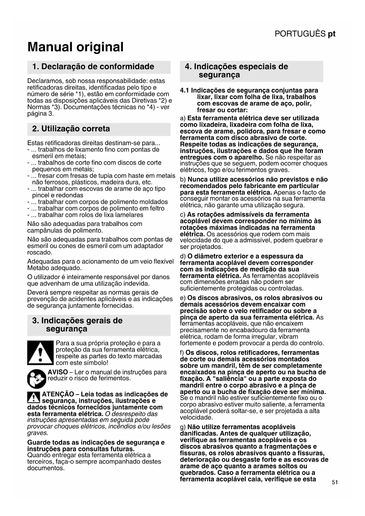 Manual original Declaramos, sob nossa responsabilidade: estas retificadoras direitas, identificadas pelo tipo e número de série *1), estão em conformidade com todas as disposições aplicáveis das Diretivas *2) e Normas *3). Documentações técnicas no *4) - ver página 3. Estas retificadoras direitas destinam-se para... - ... trabalhos de lixamento fino com pontas de esmeril em metais; - ... trabalhos de corte fino com discos de corte pequenos em metais; - ... fresar com fresas de tupia com haste em metais não ferrosos, plásticos, madeira dura, etc. - ... trabalhar com escovas de arame de aço tipo pincel e redondas - ... trabalhar com corpos de polimento moldados - ... trabalhar com corpos de polimento em feltro - ... trabalhar com rolos de lixa lamelares Não são adequadas para trabalhos com campânulas de polimento. Não são adequadas para trabalhos com pontas de esmeril ou cones de esmeril com um adaptador roscado. Adequadas para o acionamento de um veio flexível Metabo adequado. O utilizador é inteiramente responsável por danos que advenham de uma utilização indevida. Deverá sempre respeitar as normas gerais de prevenção de acidentes aplicáveis e as indicações de segurança juntamente fornecidas. Para a sua própria proteção e para a proteção da sua ferramenta elétrica, respeite as partes do texto marcadas com este símbolo! AVISO – Ler o manual de instruções para reduzir o risco de ferimentos. ATENÇÃO – Leia todas as indicações de segurança, instruções, ilustrações e dados técnicos fornecidos juntamente com esta ferramenta elétrica. O desrespeito das instruções apresentadas em seguida pode provocar choques elétricos, incêndios e/ou lesões graves. Guarde todas as indicações de segurança e instruções para consultas futuras. Quando entregar esta ferramenta elétrica a terceiros, faça-o sempre acompanhado destes documentos.