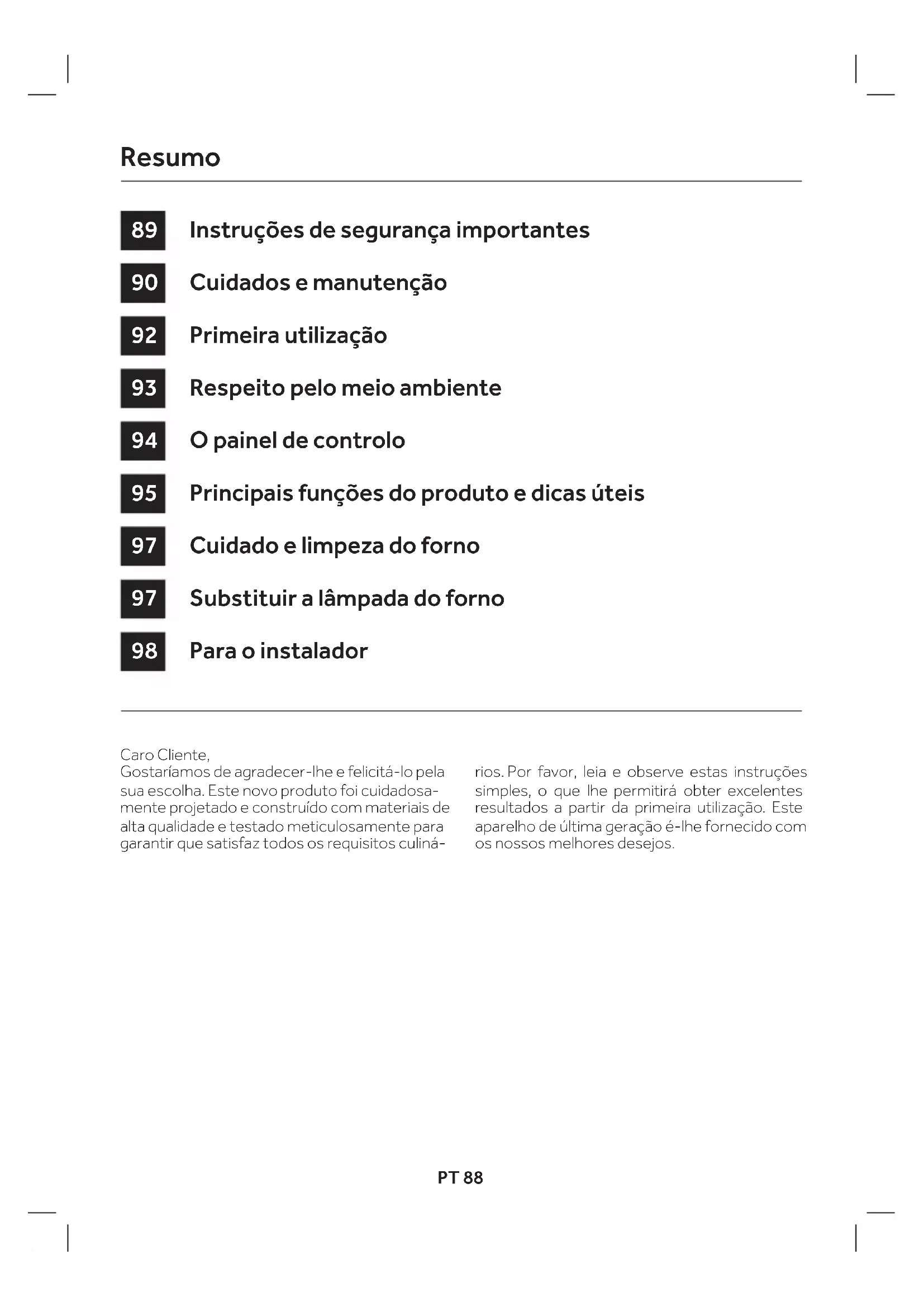 PRZEWODÓW SASO H05RR-F 3x1,5 mm² H05RR-F 3x2,5 mm² H05VV-F 3x1,5 mm² H05VV-F 3x2,5 mm² H05RN-F 3x1,5 mm² H05RN-F 3x2,5 mm² H05V2V2-F 3x1,5 mm² H05V2V2-F 3x2,5 mm²PT 88 Caro Cliente, Gostaríamos de agradecer-lhe e felicitá-lo pela sua escolha. Este novo produto foi cuidadosa- mente projetado e construído com materiais de alta qualidade e testado meticulosamente para garantir que satisfaz todos os requisitos culiná- rios. Por favor, leia e observe estas instruções simples, o que lhe permitirá obter excelentes resultados a partir da primeira utilização. Este aparelho de última geração é-lhe fornecido com os nossos melhores desejos. Instruções de segurança importantes Cuidados e manutenção Primeira utilização Respeito pelo meio ambiente O painel de controlo Principais funções do produto e dicas úteis Cuidado e limpeza do forno Substituir a lâmpada do forno Para o instalador
