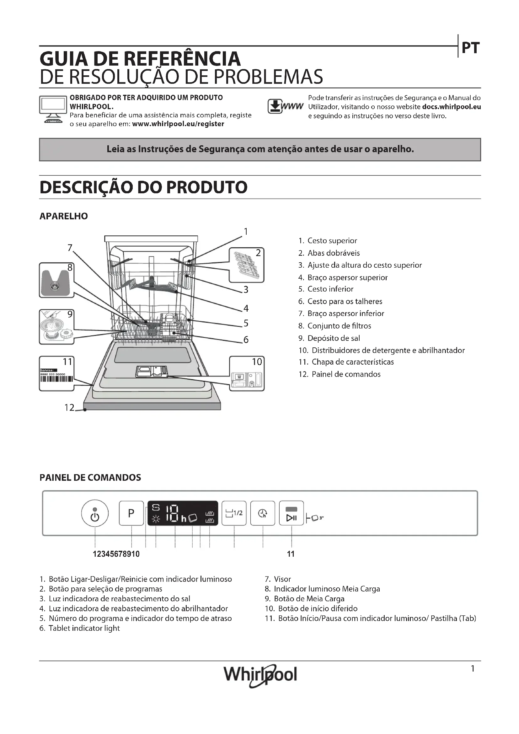 1. Cesto superior2. Abas dobráveis3. Ajuste da altura do cesto superior4. Braço aspersor superior5. Cesto inferior6. Cesto para os talheres7. Braço aspersor inferior8. Conjunto de ltros9. Depósito de sal10. Distribuidores de detergente e abrilhantador11. Chapa de características12. Painel de comandos1. Botão Ligar-Desligar/Reinicie com indicador luminoso2. Botão para seleção de programas3. Luz indicadora de reabastecimento do sal4. Luz indicadora de reabastecimento do abrilhantador5. Número do programa e indicador do tempo de atraso6. Tablet indicator light7. Visor8. Indicador luminoso Meia Carga9. Botão de Meia Carga10. Botão de início diferido11. Botão Início/Pausa com indicador luminoso/ Pastilha (Tab)