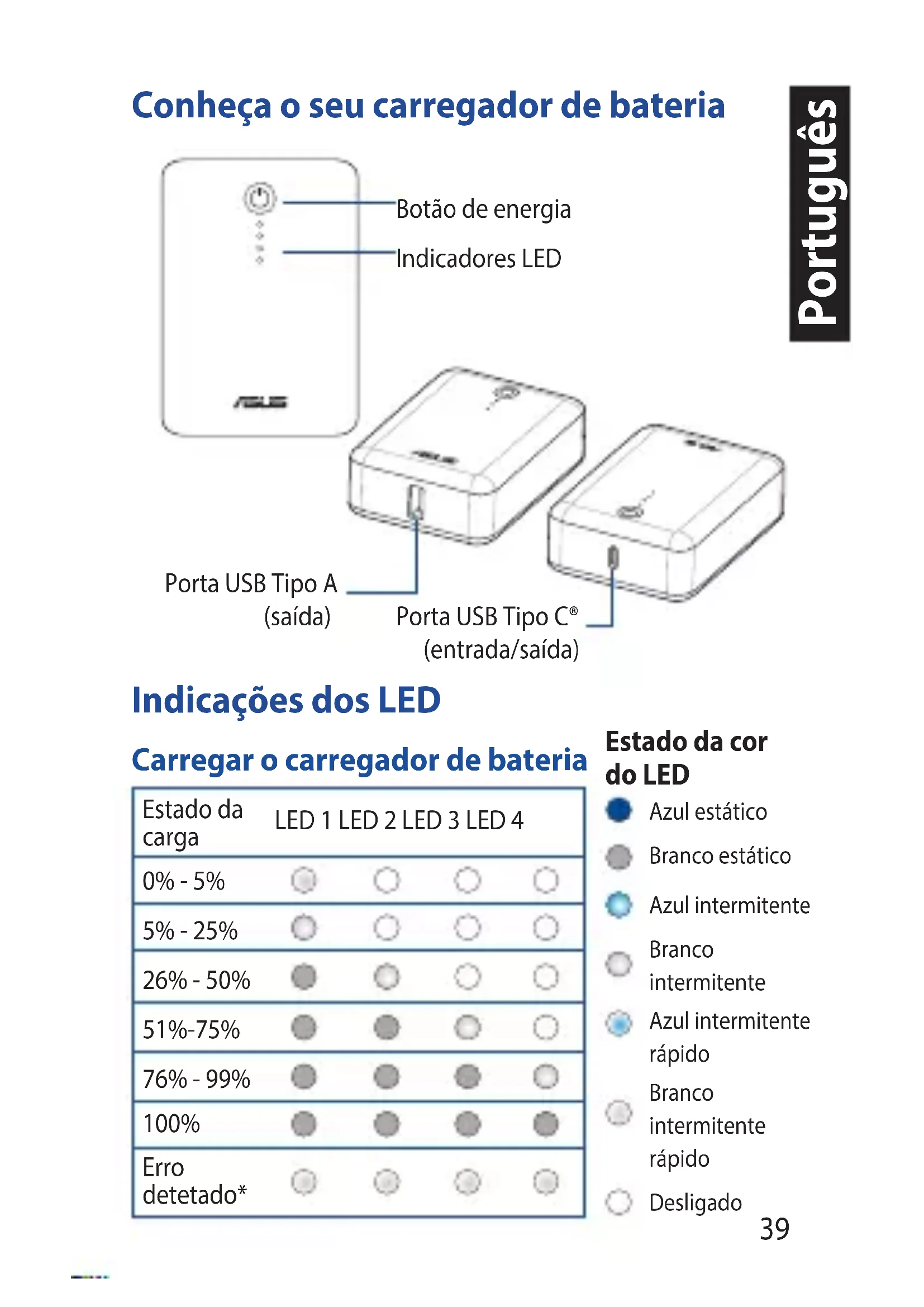 - No utilice su cargador móvil en un entorno donde la temperatura sea superior 40ºC (104ºF), ni lo someta a agua o fuego, ni intente romper la carcasa.39 Português Conheça o seu carregador de bateria Carregar o carregador de bateria Indicações dos LED Indicadores LED Botão de energia Porta USB Tipo A (saída) Porta USB Tipo C® (entrada/saída) Estado da cor do LED Estado da carga
