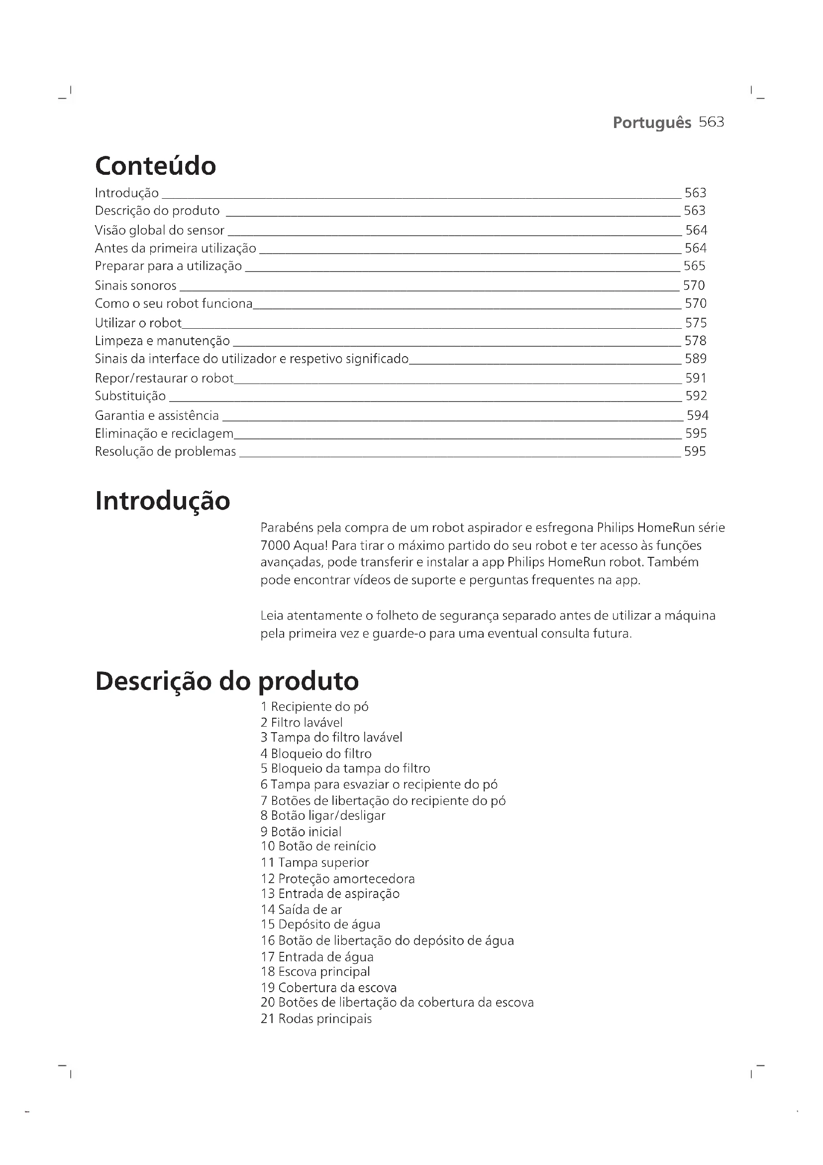 Português Conteúdo Introdução ________________________________________________________________________________ 563 Descrição do produto ______________________________________________________________________ 563 Visão global do sensor ______________________________________________________________________ 564 Antes da primeira utilização _________________________________________________________________ 564 Preparar para a utilização ___________________________________________________________________ 565 Sinais sonoros _____________________________________________________________________________ 570 Como o seu robot funciona__________________________________________________________________ 570 Utilizar o robot_____________________________________________________________________________ 575 Limpeza e manutenção _____________________________________________________________________ 578 Sinais da interface do utilizador e respetivo significado__________________________________________ 589 Repor/restaurar o robot_____________________________________________________________________ 591 Substituição _______________________________________________________________________________ 592 Garantia e assistência _______________________________________________________________________ 594 Eliminação e reciclagem_____________________________________________________________________ 595 Resolução de problemas ____________________________________________________________________ 595 Introdução Parabéns pela compra de um robot aspirador e esfregona Philips HomeRun série 7000 Aqua! Para tirar o máximo partido do seu robot e ter acesso às funções avançadas, pode transferir e instalar a app Philips HomeRun robot. Também pode encontrar vídeos de suporte e perguntas frequentes na app. Leia atentamente o folheto de segurança separado antes de utilizar a máquina pela primeira vez e guarde-o para uma eventual consulta futura. Descrição do produto 1 Recipiente do pó 2 Filtro lavável 3 Tampa do filtro lavável 4 Bloqueio do filtro 5 Bloqueio da tampa do filtro 6 Tampa para esvaziar o recipiente do pó 7 Botões de libertação do recipiente do pó 8 Botão ligar/desligar 9 Botão inicial 10 Botão de reinício 11 Tampa superior 12 Proteção amortecedora 13 Entrada de aspiração 14 Saída de ar 15 Depósito de água 16 Botão de libertação do depósito de água 17 Entrada de água 18 Escova principal 19 Cobertura da escova 20 Botões de libertação da cobertura da escova 21 Rodas principais564 Português 22 Roda dianteira 23 Pontos de contacto de carregamento (robot) 24 Escova lateral 25 Suporte para a base da esfregona 26 Base de esfregona lavável (2 unidades) 27 Cabo de alimentação (XU7000) 28 Base (carregamento) (XU7000) 29 Janela de sinal IV (XU7000) 30 Pontos de contacto de carregamento (base) 31 Tomada para o cabo de alimentação 32 Tapete (XU7000) 33 Saco do pó (2x) (XU7100) 34 Tampa do recipiente 35 Compartimento do saco para o pó 36 Base esvaziar automático (XU7100) 37 Luz indicadora 38 Janela de sinal IV 39 Rampa 40 O tubo de evacuação de resíduos 41 Saída de ar de esvaziar automático 42 Pontos de contacto de carregamento (base) 43 Abertura para saída do ar 44 Ferramenta de limpeza da escova 45 Tomada para o cabo de alimentação 46 Cabo de alimentação (XU7100) Visão global do sensor