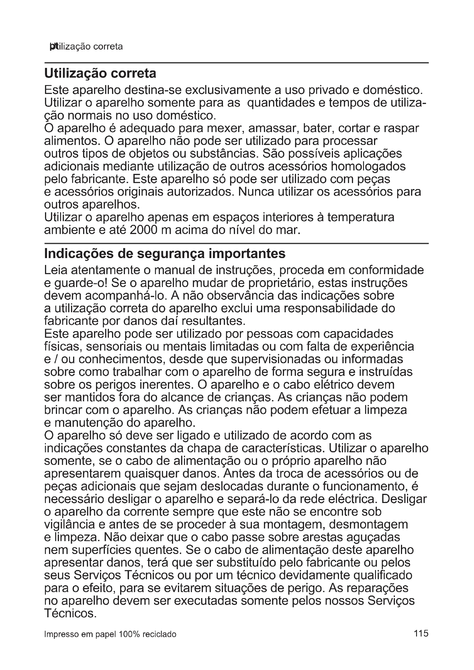 Utilização correta Este aparelho destina-se exclusivamente a uso privado e doméstico. Utilizar o aparelho somente para as quantidades e tempos de utiliza- ção normais no uso doméstico. O aparelho é adequado para mexer, amassar, bater, cortar e raspar alimentos. O aparelho não pode ser utilizado para processar outros tipos de objetos ou substâncias. São possíveis aplicações adicionais mediante utilização de outros acessórios homologados pelo fabricante. Este aparelho só pode ser utilizado com peças e acessórios originais autorizados. Nunca utilizar os acessórios para outros aparelhos. Utilizar o aparelho apenas em espaços interiores à temperatura ambiente e até 2000 m acima do nível do mar. Indicações de segurança importantes Leia atentamente o manual de instruções, proceda em conformidade e guarde-o! Se o aparelho mudar de proprietário, estas instruções devem acompanhá-lo. A não observância das indicações sobre a utilização correta do aparelho exclui uma responsabilidade do fabricante por danos daí resultantes. Este aparelho pode ser utilizado por pessoas com capacidades físicas, sensoriais ou mentais limitadas ou com falta de experiência e / ou conhecimentos, desde que supervisionadas ou informadas sobre como trabalhar com o aparelho de forma segura e instruídas sobre os perigos inerentes. O aparelho e o cabo elétrico devem ser mantidos fora do alcance de crianças. As crianças não podem brincar com o aparelho. As crianças não podem efetuar a limpeza e manutenção do aparelho. O aparelho só deve ser ligado e utilizado de acordo com as indicações constantes da chapa de características. Utilizar o aparelho somente, se o cabo de alimentação ou o próprio aparelho não apresentarem quaisquer danos. Antes da troca de acessórios ou de peças adicionais que sejam deslocadas durante o funcionamento, é necessário desligar o aparelho e separá-lo da rede eléctrica. Desligar o aparelho da corrente sempre que este não se encontre sob vigilância e antes de se proceder à sua montagem, desmontagem e limpeza. Não deixar que o cabo passe sobre arestas aguçadas nem superfícies quentes. Se o cabo de alimentação deste aparelho apresentar danos, terá que ser substituído pelo fabricante ou pelos seus Serviços Técnicos ou por um técnico devidamente qualificado para o efeito, para se evitarem situações de perigo. As reparações no aparelho devem ser executadas somente pelos nossos Serviços Técnicos. Impresso em papel 100% reciclado Utilização correta116
