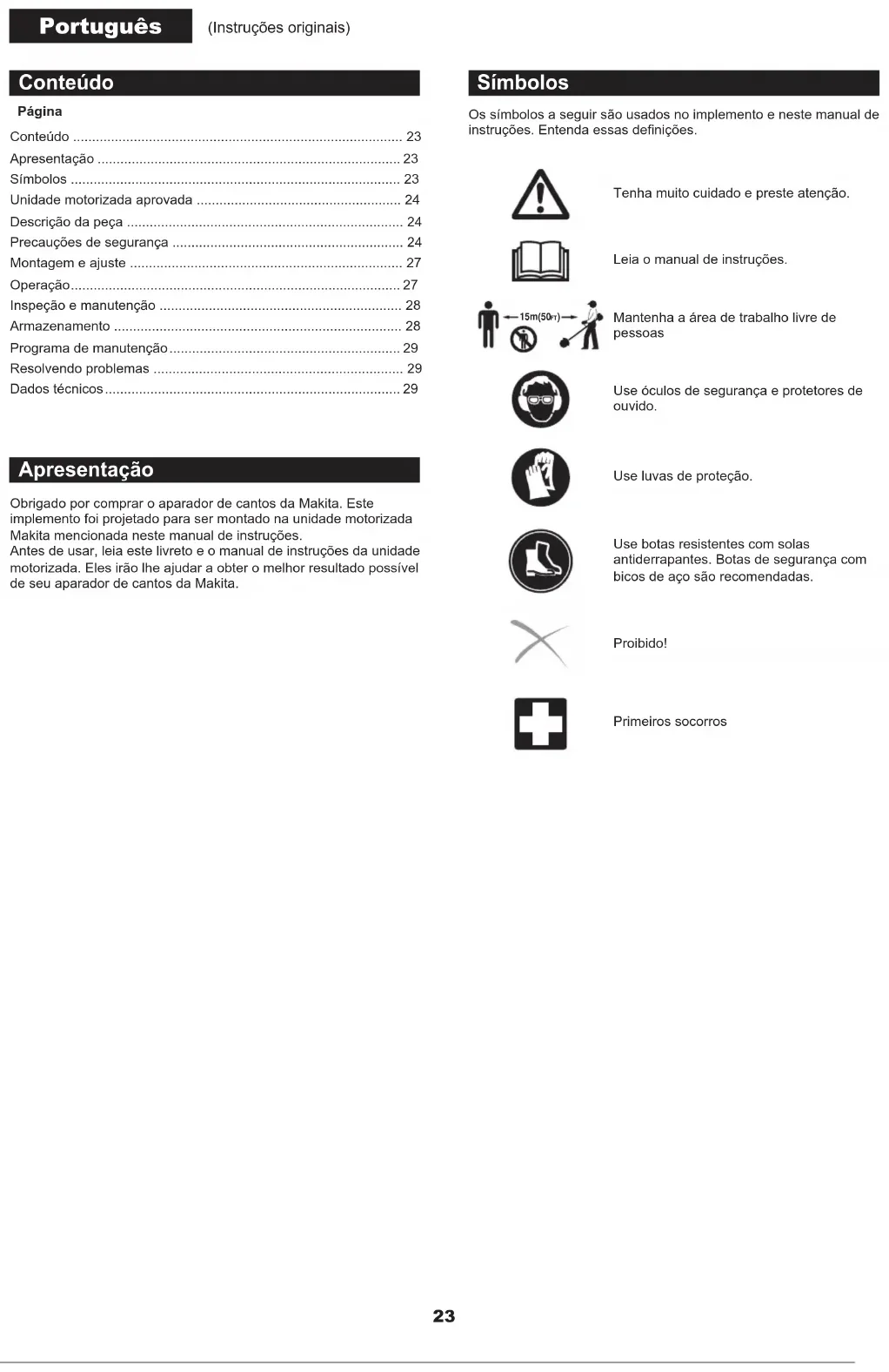 - Mantenha a rea de trabalho livre de pessoas Use óculos de segurança e protetores de ouvido. Use luvas de proteço. Use botas resistentes com solas antiderrapantes. Botas de segurança com bicos de aço so recomendadas. Proibido! Primeiros socorros Conteúdo p. 23