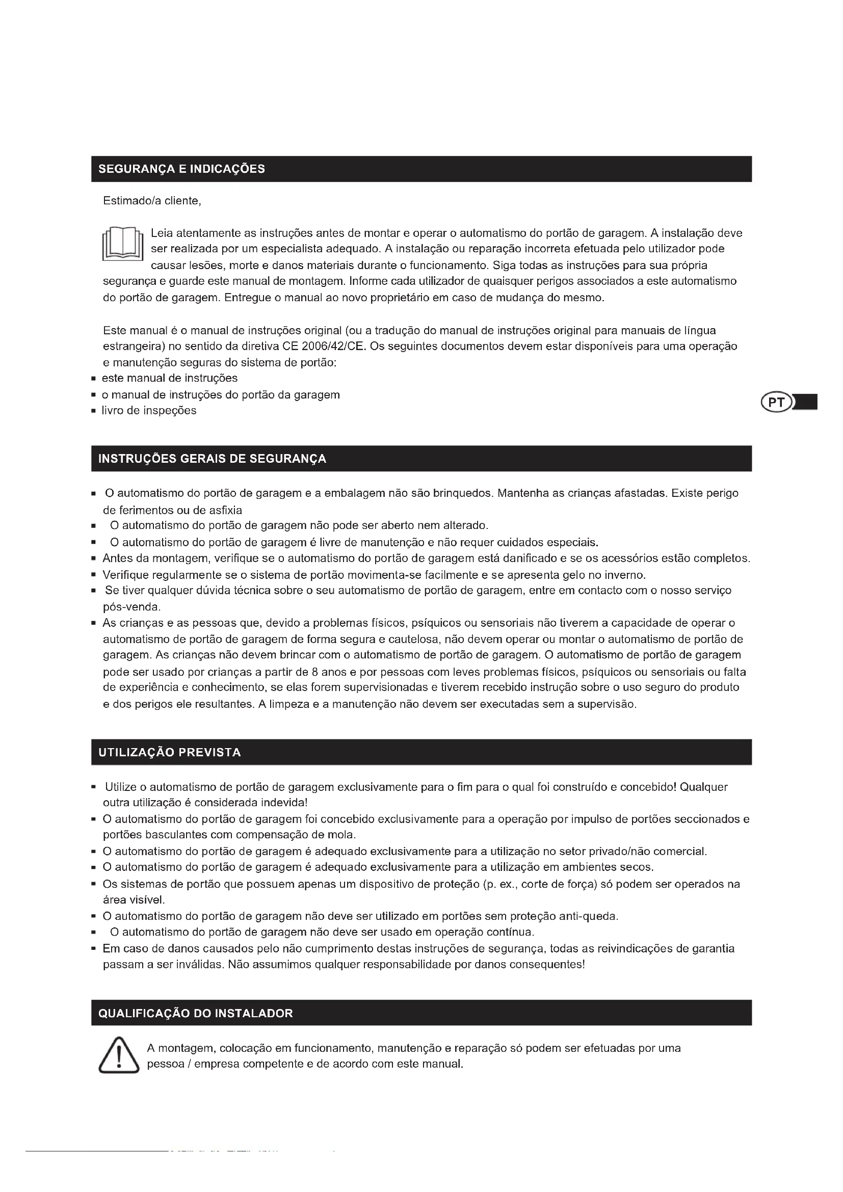 Estimado/a cliente, Leia atentamente as instruções antes de montar e operar o automatismo do portão de garagem A instalação deve ser realizada por um especialista adequado A instalação ou reparação incorreta efetuada pelo utilizador pode causar lesões, morte e danos materiais durante o funcionamento Siga todas as instruções para sua própria segurança e guarde este manual de montagem Informe cada utilizador de quaisquer perigos associados a este automatismo do portão de garagem Entregue o manual ao novo proprietário em caso de mudança do mesmo Este manual é o manual de instruções original (ou a tradução do manual de instruções original para manuais de língua estrangeira) no sentido da diretiva CE 2006/42/CE. Os seguintes documentos devem estar disponíveis para uma operação e manutenção seguras do sistema de portão: este manual de instruções o manual de instruções do portão da garagem livro de inspeções