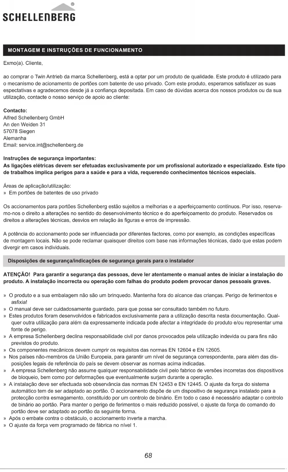 Exmo(a). Cliente, ao comprar o Twin Antrieb da marca Schellenberg, está a optar por um produto de qualidade. Este produto é utilizado para o mecanismo de acionamento de portões com batente de uso privado. Com este produto, esperamos satisfazer as suas espectativas e agradecemos desde já a conança depositada. Em caso de dúvidas acerca dos nossos produtos ou da sua utilização, contacte o nosso serviço de apoio ao cliente: Contacto: Alfred Schellenberg GmbH An den Weiden 31 57078 Siegen Alemanha Email: service.int@schellenberg.de Instruções de segurança importantes: As ligações elétricas devem ser efetuadas exclusivamente por um prossional autorizado e especializado. Este tipo de trabalhos implica perigos para a saúde e para a vida, requerendo conhecimentos técnicos especiais. Áreas de aplicação/utilização: » Em portões de batentes de uso privado Os accionamentos para portões Schellenberg estão sujeitos a melhorias e a aperfeiçoamento contínuos. Por isso, reserva- mo-nos o direito a alterações no sentido do desenvolvimento técnico e do aperfeiçoamento do produto. Reservados os direitos a alterações técnicas, desvios em relação às guras e erros de impressão. A potência do accionamento pode ser inuenciada por diferentes factores, como por exemplo, as condições especícas de montagem locais. Não se pode reclamar quaisquer direitos com base nas informações técnicas, dado que estas podem divergir em casos individuais. Disposições de segurança/indicações de segurança gerais para o instalador ATENÇÃO! Para garantir a segurança das pessoas, deve ler atentamente o manual antes de iniciar a instalação do produto. A instalação incorrecta ou operação com falhas do produto podem provocar danos pessoais graves. » O produto e a sua embalagem não são um brinquedo. Mantenha fora do alcance das crianças. Perigo de ferimentos e asxia! » O manual deve ser cuidadosamente guardado, para que possa ser consultado também no futuro. » Estes produtos foram desenvolvidos e fabricados exclusivamente para a utilização descrita nesta documentação. Qual- quer outra utilização para além da expressamente indicada pode afectar a integridade do produto e/ou representar uma fonte de perigo. » A empresa Schellenberg declina responsabilidade civil por danos provocados pela utilização indevida ou para ns não previstos do produto. » Os componentes mecânicos devem cumprir os requisitos das normas EN 12604 e EN 12605. » Nos países não-membros da União Europeia, para garantir um nível de segurança correspondente, para além das dis- posições legais de referência do país se devem observar as normas acima indicadas. » A empresa Schellenberg não assume qualquer responsabilidade civil pelo fabrico de versões incorretas dos dispositivos de bloqueio, bem como por deformações que eventualmente surjam durante a operação. » A instalação deve ser efectuada sob observância das normas EN 12453 e EN 12445. O ajuste da força do sistema automático tem de ser adaptado ao portão. O accionamento dispõe de um dispositivo de segurança instalado para a protecção contra esmagamento, constituído por um controlo de binário. Em todo o caso é necessário adaptar o controlo de binário ao portão. Para manter o perigo de ferimentos o mais reduzido possível, o ajuste da força do comando do portão deve ser adaptado ao portão da seguinte forma. » Após o embate contra o obstáculo, o accionamento inverte a marcha. » O ajuste da força vem programado de fábrica no nível 1.