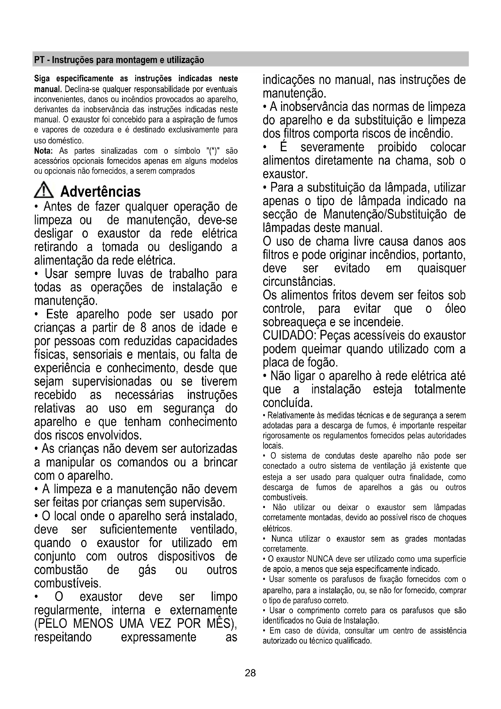 - Para a substituição da lâmpada, utilizar apenas o tipo de lâmpada indicado na secção de Manutenção/Substituição de lâmpadas deste manual. O uso de chama livre causa danos aos filtros e pode originar incêndios, portanto, deve ser evitado em quaisquer circunstâncias. Os alimentos fritos devem ser feitos sob controle, para evitar que o óleo sobreaqueça e se incendeie. CUIDADO: Peças acessíveis do exaustor podem queimar quando utilizado com a placa de fogão.