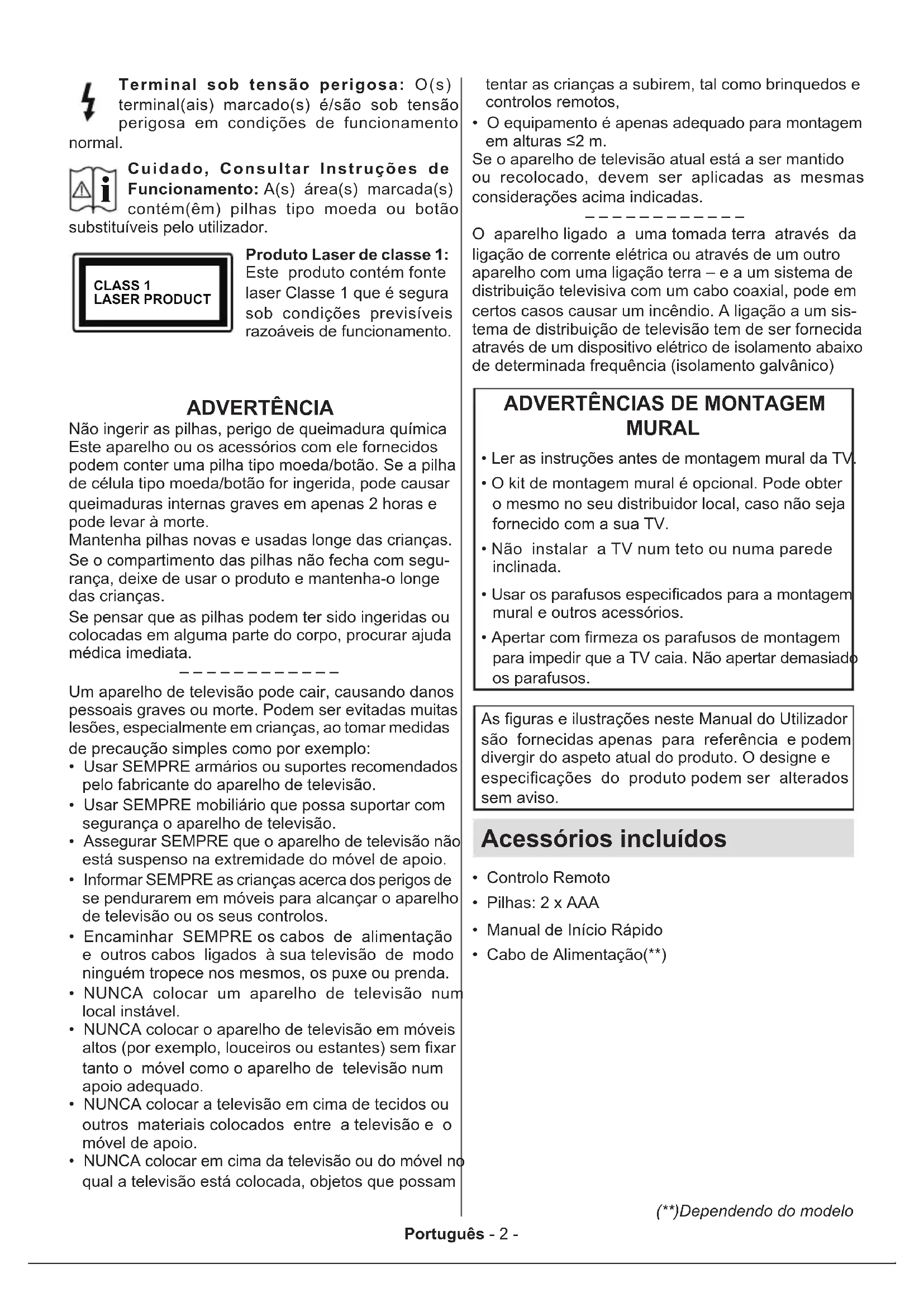 Cuidado, Consultar Instruções de Funcionamento: A(s) área(s) marcada(s) contém(êm) pilhas tipo moeda ou botão substituíveis pelo utilizador. CLASS 1 LASER PRODUCT Produto Laser de classe 1: Este produto contém fonte laser Classe 1 que é segura sob condições previsíveis razoáveis de funcionamento. ADVERTÊNCIA Não ingerir as pilhas, perigo de queimadura química Este aparelho ou os acessórios com ele fornecidos podem conter uma pilha tipo moeda/botão. Se a pilha de célula tipo moeda/botão for ingerida, pode causar queimaduras internas graves em apenas 2 horas e pode levar à morte. Mantenha pilhas novas e usadas longe das crianças. Se o compartimento das pilhas não fecha com segu- rança, deixe de usar o produto e mantenha-o longe das crianças. Se pensar que as pilhas podem ter sido ingeridas ou colocadas em alguma parte do corpo, procurar ajuda médica imediata. – – – – – – – – – – – – Um aparelho de televisão pode cair, causando danos pessoais graves ou morte. Podem ser evitadas muitas lesões, especialmente em crianças, ao tomar medidas de precaução simples como por exemplo: