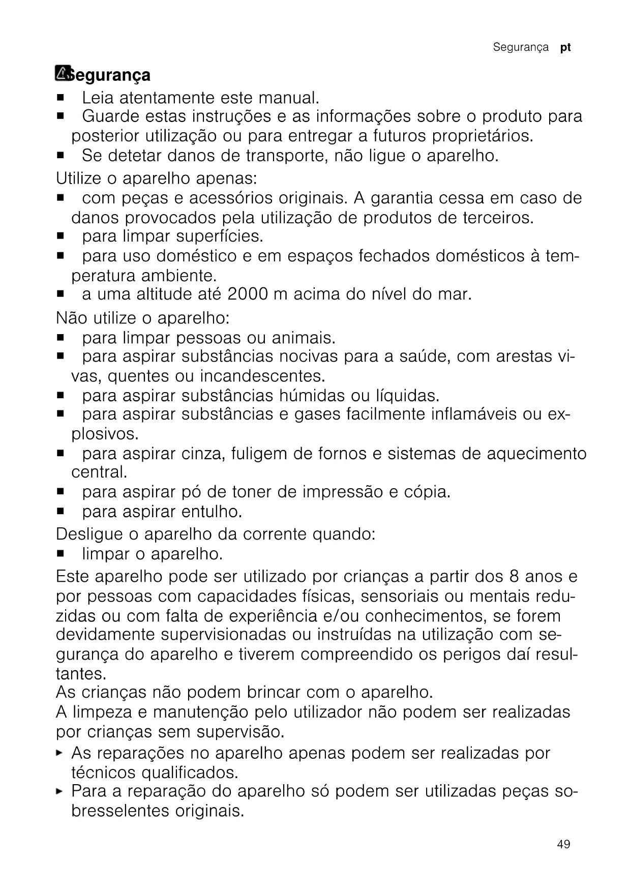 www.bosch-home.com en las secciones referentes al producto y servicio al cliente, en el área de manuales y documentos. Información sobre la directiva de diseño ecológicoInformación sobre la directiva de diseño ecológico Esta aspiradora es una aspiradora domésti- ca y está clasificada como aspiradora uni- versal. Para limpiar moquetas, utilizar la boquilla universal conmutable. Para limpiar suelos duros, utilice la boquilla para suelos duros y ranuras de prueba, si se incluye en el paquete. Las especificaciones de rendimiento de es- te aparato se basan en los métodos de me- dición y cálculo establecidos en la Directiva (UE) n.º 666/2013 y las normas EN 60312-1, EN 60704-2-1 y EN 60335-2-2. 48Segurança pt Segurança Segurança ¡ Leia atentamente este manual. ¡ Guarde estas instruções e as informações sobre o produto para posterior utilização ou para entregar a futuros proprietários. ¡ Se detetar danos de transporte, não ligue o aparelho. Utilize o aparelho apenas: ¡ com peças e acessórios originais. A garantia cessa em caso de danos provocados pela utilização de produtos de terceiros. ¡ para limpar superfícies. ¡ para uso doméstico e em espaços fechados domésticos à tem- peratura ambiente. ¡ a uma altitude até 2000m acima do nível do mar. Não utilize o aparelho: ¡ para limpar pessoas ou animais. ¡ para aspirar substâncias nocivas para a saúde, com arestas vi- vas, quentes ou incandescentes. ¡ para aspirar substâncias húmidas ou líquidas. ¡ para aspirar substâncias e gases facilmente inflamáveis ou ex- plosivos. ¡ para aspirar cinza, fuligem de fornos e sistemas de aquecimento central. ¡ para aspirar pó de toner de impressão e cópia. ¡ para aspirar entulho. Desligue o aparelho da corrente quando: ¡ limpar o aparelho. Este aparelho pode ser utilizado por crianças a partir dos 8 anos e por pessoas com capacidades físicas, sensoriais ou mentais redu- zidas ou com falta de experiência e/ou conhecimentos, se forem devidamente supervisionadas ou instruídas na utilização com se- gurança do aparelho e tiverem compreendido os perigos daí resul- tantes. As crianças não podem brincar com o aparelho. A limpeza e manutenção pelo utilizador não podem ser realizadas por crianças sem supervisão. As reparações no aparelho apenas podem ser realizadas por técnicos qualificados. Para a reparação do aparelho só podem ser utilizadas peças so- bresselentes originais. 49pt Segurança Se o cabo de alimentação deste aparelho sofrer algum dano, deverá ser substituído pelo fabricante ou pela sua Assistência Técnica, ou por um técnico devidamente qualificado para o efei- to, para se evitarem situações de perigo. Nunca operar um aparelho danificado. Nunca operar um aparelho com a superfície fissurada ou que- brada. Para desligar o aparelho da fonte de alimentação nunca puxar pelo cabo elétrico. Remover o cabo elétrico sempre pela ficha. Nunca puxar ou mover o aparelho pelo cabo elétrico. Se o aparelho ou o cabo elétrico estiver avariado, puxe o cabo ou a ficha da tomada ou desligue o fusível no quadro elétrico. Contactar a Assistência Técnica.