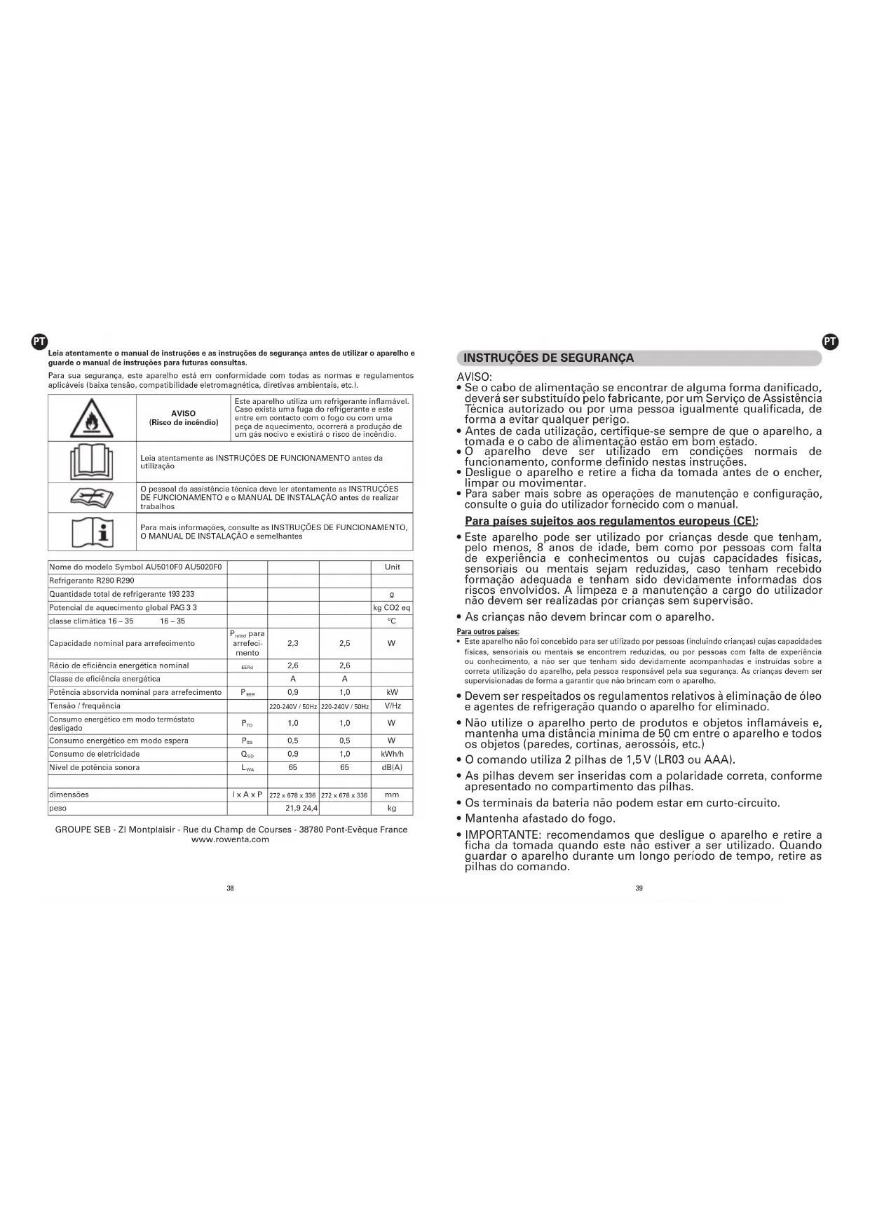 Nunca desmonte o aparelho pelos seus próprios meios, uma vez que o gás R290 requer um acordo específico para a reparação. Um aparelho mal reparado pode ser perigoso para o utilizador. Não utilize o aparelho e contacte um Serviço de Assistência Técnica autorizado se: • O aparelho tiver sofrido uma queda. • O aparelho ou o cabo de alimentação estiverem danificados. • O aparelho não funcionar corretamente. Pode encontrar uma lista de Serviços de Assistência Técnica autorizados no website da Rowenta. PROTEÇÃO DO AMBIENTE EM PRIMEIRO LUGAR! O aparelho contém materiais valiosos que podem ser recuperados ou reciclados. Entregue-o num ponto de recolha de resíduos, para possibilitar o seu tratamento. Não elimine as pilhas juntamente com o lixo doméstico. Entregue-as em pontos de recolha próprios para pilhas. Também pode encontrar estas instruções no nosso site www.rowenta.comLeggere attentamente le istruzioni e le avvertenze di sicurezza prima di usare l’apparecchio e conservare il manuale di istruzioni per riferimento futuro. Per motivi di sicurezza, questo apparecchio è conforme a tutti gli standard e alle normative in vigore (direttive in materia di bassa tensione, compatibilità elettromagnetica, ambiente, ecc.).AVVERTENZE (Rischio di incendio)Questa unità utilizza un refrigerante infiammabile.Se il refrigerante fuoriesce ed entra in contatto con il fuoco o con la parte riscaldante, vengono generati gas nocivi e vi è il rischio di incendio.Leggere attentamente le ISTRUZIONI DI FUNZIONAMENTO prima dell’usoIl personale di assistenza deve leggere attentamente le ISTRUZIONI DI FUNZIONAMENTO e IL MANUALE DI INSTALLAZIONE prima dell’usoUlteriori informazioni sono disponibili nelle ISTRUZIONI DI FUNZIONAMENTO, nel MANUALE DI INSTALLAZIONE e in documenti similiNome del modello Symbol AU5010F0 AU5020F0 UnitRefrigerante R290 R290 Quantità totale de refrigerante 193 233 g Potenziale di riscaldamento globale GWP 3 3 Kg CO2 eq classe climatica 16 – 35 16 – 35 °CCapacità nominale di raffreddamento rated para arrefecimento2,3 2,5 WIndice di efficienza energetica nominale EER 2,6 2,6Classe di efficienza energetica A APotenza nominale assorbita per il raffred-damento