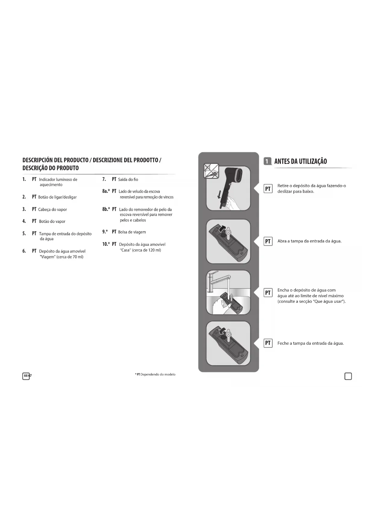 8a.* PT Lado de veludo da escova reversível para remoção de vincos 8b.* PT Lado do removedor de pelo da escova reversível para remover pelos e cabelos 9.* PT Bolsa de viagem 10.* PT Depósito da água amovível ‘‘Casa’’ (cerca de 120 ml) DESCRIPCIÓN DEL PRODUCTO / DESCRIZIONE DEL PRODOTTO /