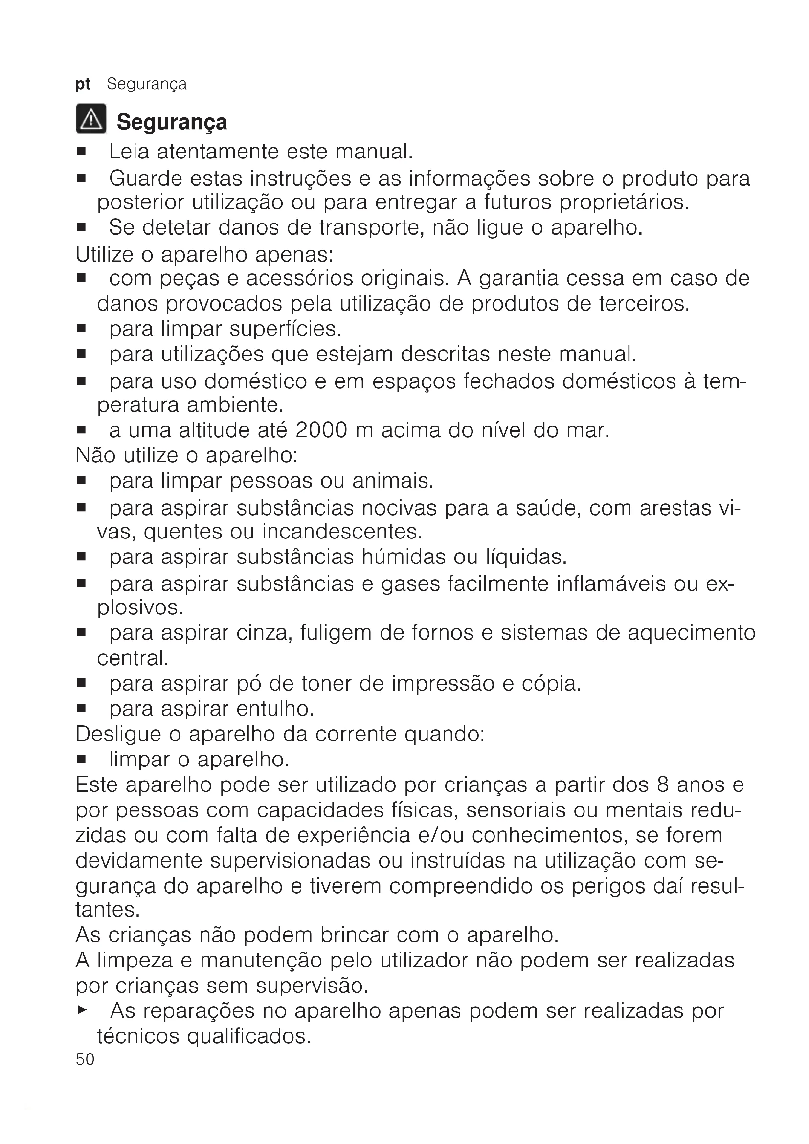 Segurança ¡ Leia atentamente este manual. ¡ Guarde estas instruções e as informações sobre o produto para posterior utilização ou para entregar a futuros proprietários. ¡ Se detetar danos de transporte, não ligue o aparelho. Utilize o aparelho apenas: ¡ com peças e acessórios originais. A garantia cessa em caso de danos provocados pela utilização de produtos de terceiros. ¡ para limpar superfícies. ¡ para utilizações que estejam descritas neste manual. ¡ para uso doméstico e em espaços fechados domésticos à tem- peratura ambiente. ¡ a uma altitude até 2000m acima do nível do mar. Não utilize o aparelho: ¡ para limpar pessoas ou animais. ¡ para aspirar substâncias nocivas para a saúde, com arestas vi- vas, quentes ou incandescentes. ¡ para aspirar substâncias húmidas ou líquidas. ¡ para aspirar substâncias e gases facilmente inflamáveis ou ex- plosivos. ¡ para aspirar cinza, fuligem de fornos e sistemas de aquecimento central. ¡ para aspirar pó de toner de impressão e cópia. ¡ para aspirar entulho. Desligue o aparelho da corrente quando: ¡ limpar o aparelho. Este aparelho pode ser utilizado por crianças a partir dos 8 anos e por pessoas com capacidades físicas, sensoriais ou mentais redu- zidas ou com falta de experiência e/ou conhecimentos, se forem devidamente supervisionadas ou instruídas na utilização com se- gurança do aparelho e tiverem compreendido os perigos daí resul- tantes. As crianças não podem brincar com o aparelho. A limpeza e manutenção pelo utilizador não podem ser realizadas por crianças sem supervisão. ▶ As reparações no aparelho apenas podem ser realizadas por técnicos qualificados.Segurança pt