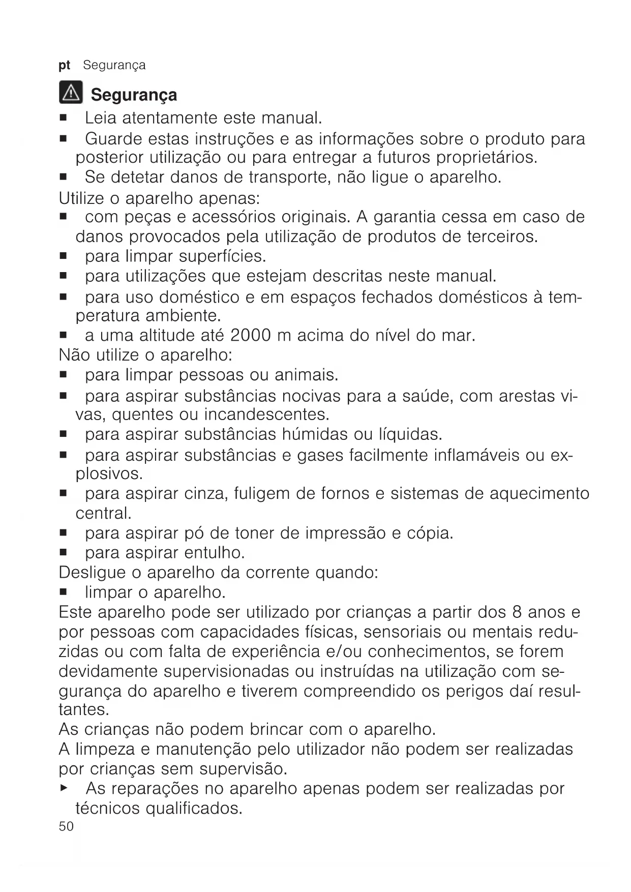 Segurança ¡ Leia atentamente este manual. ¡ Guarde estas instruções e as informações sobre o produto para posterior utilização ou para entregar a futuros proprietários. ¡ Se detetar danos de transporte, não ligue o aparelho. Utilize o aparelho apenas: ¡ com peças e acessórios originais. A garantia cessa em caso de danos provocados pela utilização de produtos de terceiros. ¡ para limpar superfícies. ¡ para utilizações que estejam descritas neste manual. ¡ para uso doméstico e em espaços fechados domésticos à tem- peratura ambiente. ¡ a uma altitude até 2000m acima do nível do mar. Não utilize o aparelho: ¡ para limpar pessoas ou animais. ¡ para aspirar substâncias nocivas para a saúde, com arestas vi- vas, quentes ou incandescentes. ¡ para aspirar substâncias húmidas ou líquidas. ¡ para aspirar substâncias e gases facilmente inflamáveis ou ex- plosivos. ¡ para aspirar cinza, fuligem de fornos e sistemas de aquecimento central. ¡ para aspirar pó de toner de impressão e cópia. ¡ para aspirar entulho. Desligue o aparelho da corrente quando: ¡ limpar o aparelho. Este aparelho pode ser utilizado por crianças a partir dos 8 anos e por pessoas com capacidades físicas, sensoriais ou mentais redu- zidas ou com falta de experiência e/ou conhecimentos, se forem devidamente supervisionadas ou instruídas na utilização com se- gurança do aparelho e tiverem compreendido os perigos daí resul- tantes. As crianças não podem brincar com o aparelho. A limpeza e manutenção pelo utilizador não podem ser realizadas por crianças sem supervisão. ▶ As reparações no aparelho apenas podem ser realizadas por técnicos qualificados.Segurança pt
