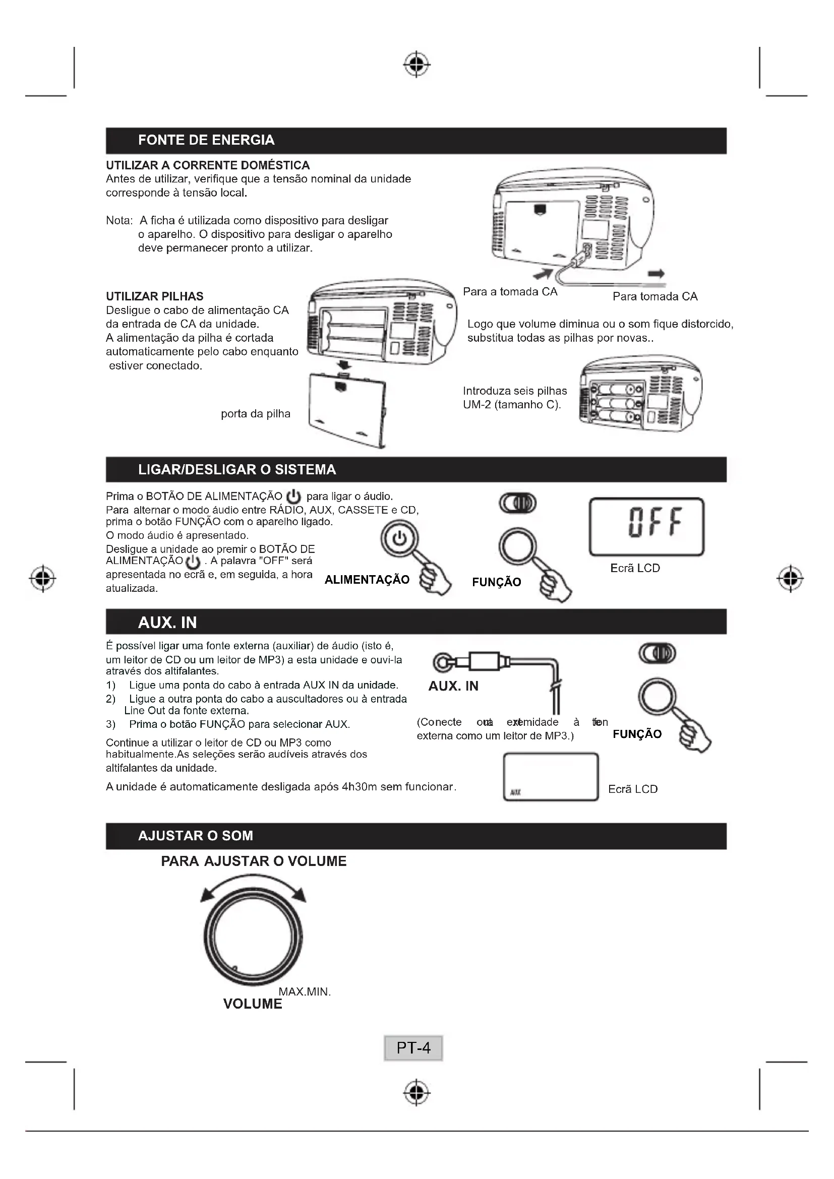 PT-3Prima o BOTÃO DE ALIMENTAÇÃO para ligar o áudio. Para alternar o modo áudio entre RÁDIO, AUX, CASSETE e CD, primaobotãoFUNÇÃOcomoaparelholigado. O modo áudio é apresentado. Desligue a unidade ao premir o BOTÃO DE ALIMENTAÇÃO.Apalavra"OFF"será apresentada no ecrã e, em seguida, a hora atualizada.