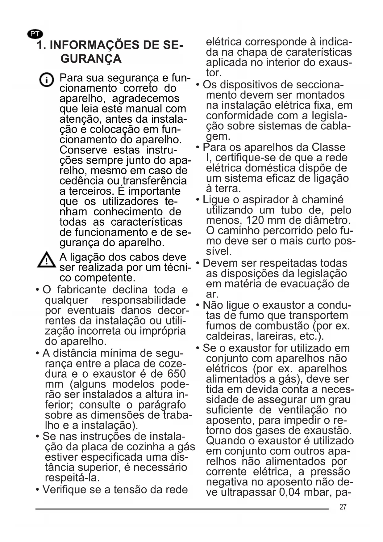 - Se o exaustor for utilizado em conjunto com aparelhos não elétricos (por ex. aparelhos alimentados a gás), deve ser tida em devida conta a neces- sidade de assegurar um grau suficiente de ventilação no aposento, para impedir o re- torno dos gases de exaustão. Quando o exaustor é utilizado em conjunto com outros apa- relhos não alimentados por corrente elétrica, a pressão negativa no aposento não de- ve ultrapassar 0,04 mbar, pa- 27ra evitar que os fumos regres- sem ao aposento através do exaustor.
