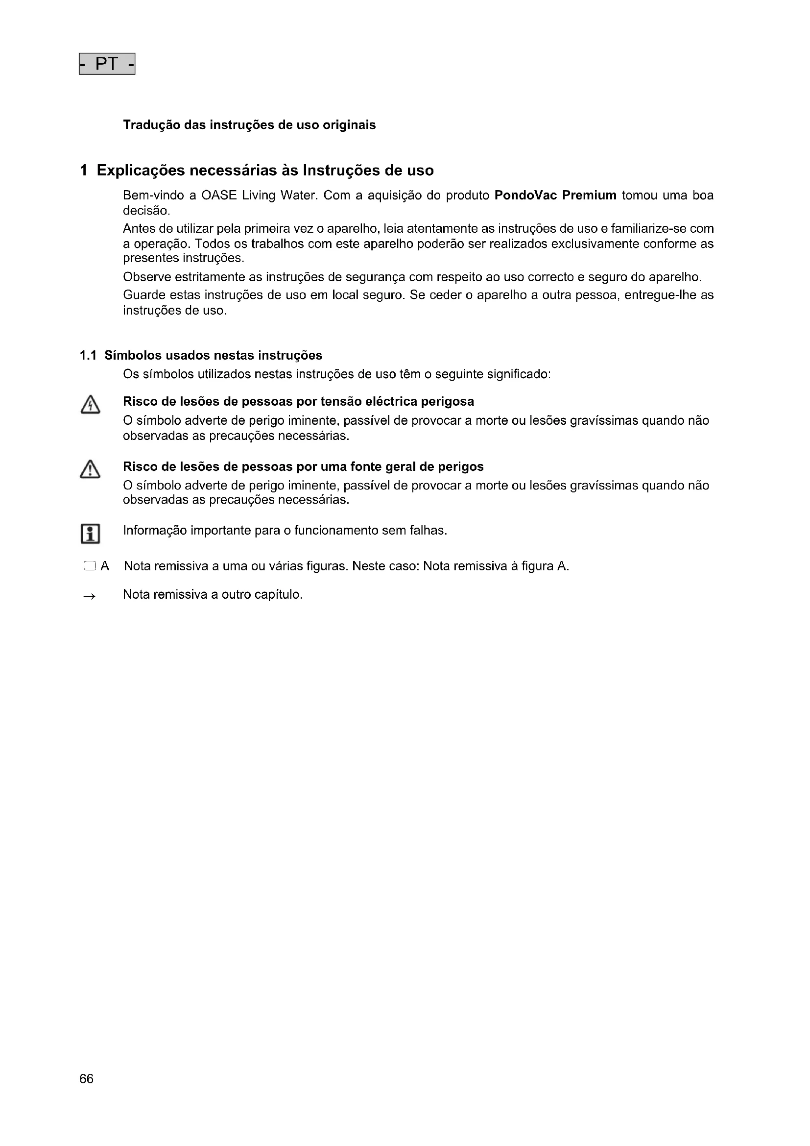 1 Explicações necessárias às Instruções de uso Bem-vindo a OASE Living Water. Com a aquisição do produto PondoVac Premium tomou uma boa decisão. Antes de utilizar pela primeira vez o aparelho, leia atentamente as instruções de uso e familiarize-se com a operação. Todos os trabalhos com este aparelho poderão ser realizados exclusivamente conforme as presentes instruções. Observe estritamente as instruções de segurança com respeito ao uso correcto e seguro do aparelho. Guarde estas instruções de uso em local seguro. Se ceder o aparelho a outra pessoa, entregue-lhe as instruções de uso.