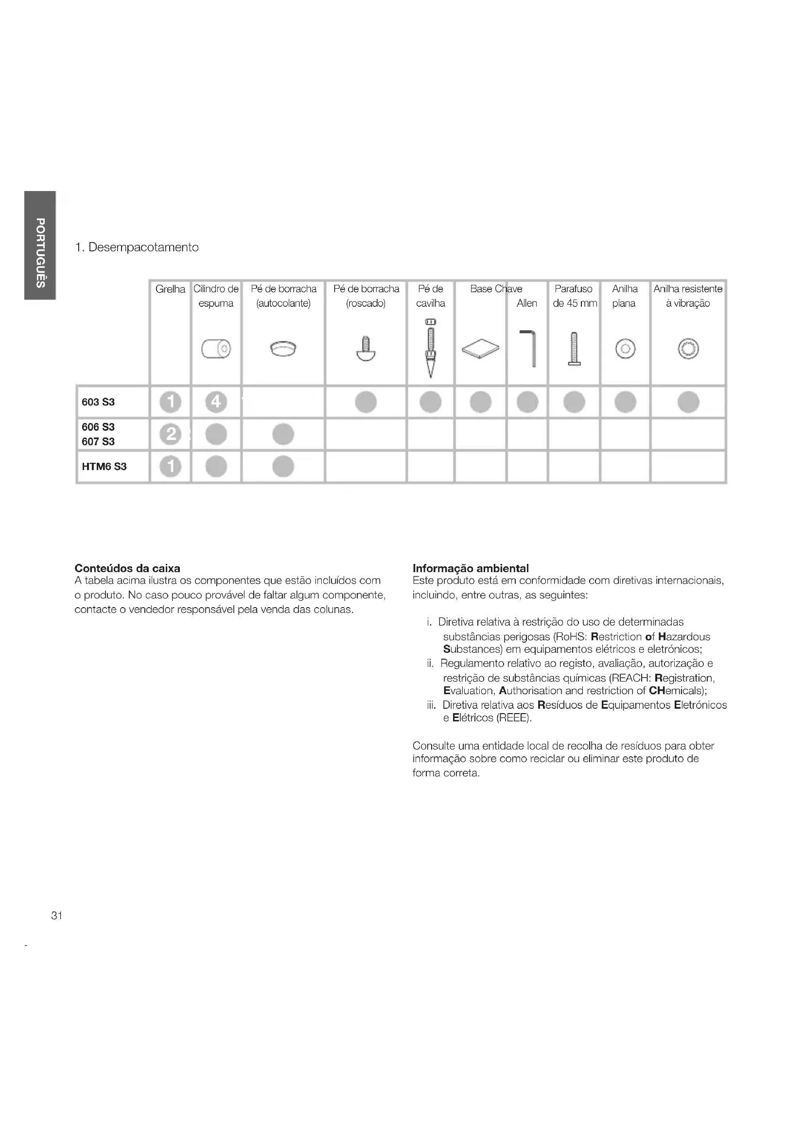 PORTUGUÊS Conteúdos da caixa A tabela acima ilustra os componentes que estão incluídos com o produto. No caso pouco provável de faltar algum componente, contacte o vendedor responsável pela venda das colunas. Informação ambiental Este produto está em conformidade com diretivas internacionais, incluindo, entre outras, as seguintes: