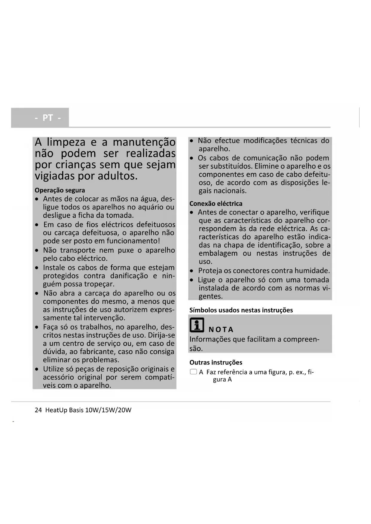 - Ligue o aparelho só com uma tomada instalada de acordo com as normas vi- gentes. Símbolos usados nestas instruções NOTA Informações que facilitam a compreen- são. Outras instruções A Faz referência a uma figura, p. ex., fi- gura A- PT -