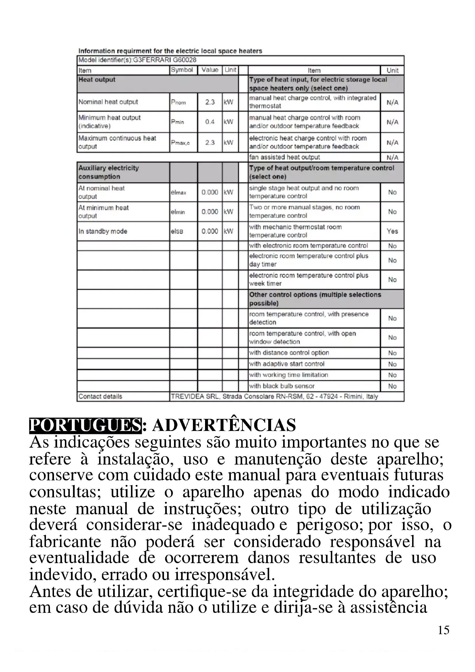 The product is made of non-biodegradable and potentially polluting substances if not properly disposed of; other parts can be recycled. It’s our duty to contribute to the ecological health of the environment following the correct procedures for disposal. The crossed out wheelie bin symbol indicates the product complies with the requirements of the new directives introduced to protect the environment (2002/96/EC, 2003/108/EC, 2002/95/EC, 2012/19/EC) and must be properly disposed at the end of its lifetime. If you need further information, ask for the dedicated waste disposal areas at your place of residence. Who does not dispose of the product as specified in this section shall be liable according to the law. RESÍDUOS DE APARELHIOS ELÉCTRICOS E ELÉCTRÓNICOS O aparelho é composto de algumas partes não biodegradáveis e de substâncias potencialmente tóxicas para o ambiente, se não forem correctamente eliminadas; outras partes podem ser recicladas. É dever de todos contribuir para a saúde ecológica do ambiente. Observando os correctos procedimentos de eliminação. O símbolo mostrado ao lado indica que o aparelho responde aos requisitos exigidos pelas novas directivas introduzidas pela tutela do ambiente (2002/96/EC, 2003/108/EC, 2002/95/EC, 2012/19/EC) e que deve ser eliminado correctamente no final do seu período de vida. Peça informações na câmara municipal da sua área de residência, se precisar de saber a localização dos centros de recolha deste tipo de resíduos. Quem não eliminar o aparelho do modo indicado neste parágrafo responde segundo as leis em vigor.