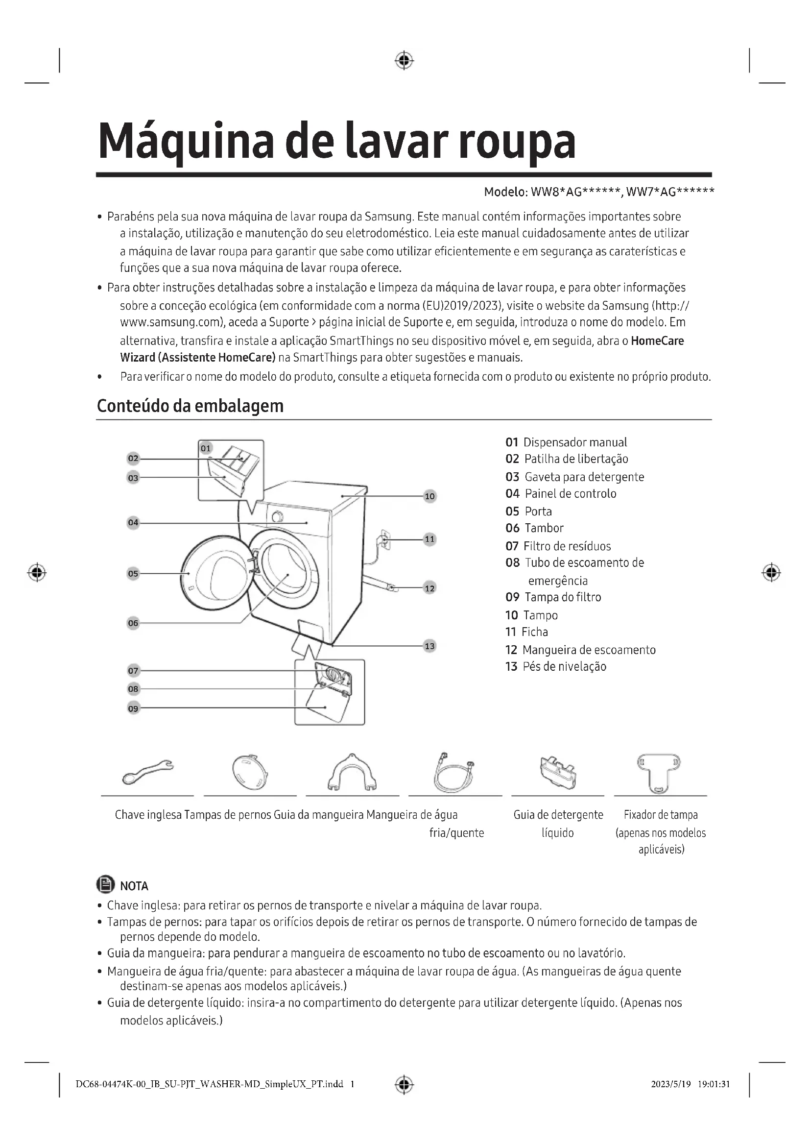 - Para obter instruções detalhadas sobre a instalação e limpeza da máquina de lavar roupa, e para obter informações sobre a conceção ecológica (em conformidade com a norma (EU)2019/2023), visite o website da Samsung (http:// www.samsung.com), aceda a Suporte > página inicial de Suporte e, em seguida, introduza o nome do modelo. Em alternativa, transfira e instale a aplicação SmartThings no seu dispositivo móvel e, em seguida, abra o HomeCare Wizard (Assistente HomeCare) na SmartThings para obter sugestões e manuais.