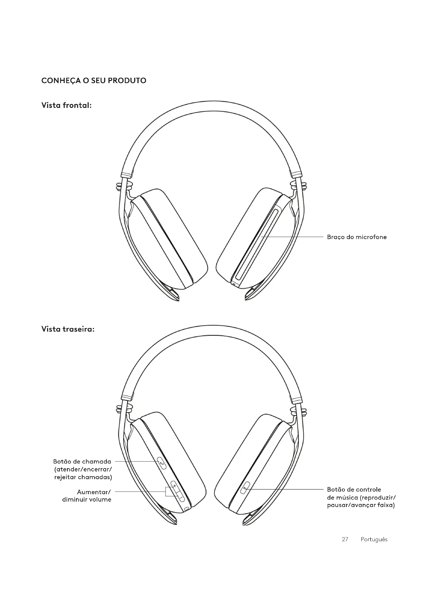 em sua cabeça. Deslize os fones de ouvido para cima e para baixo no arco de cabeça até que seencaixem confortavelmente em suas orelhas. 30PortuguêsCONTROLES DE FONES DE OUVIDO Observação: - A funcionalidade de controle de mídia depende do tipo de aplicativo. - As atividades de chamada são sempre a primeira prioridade. Quando dois dispositivos Bluetooth