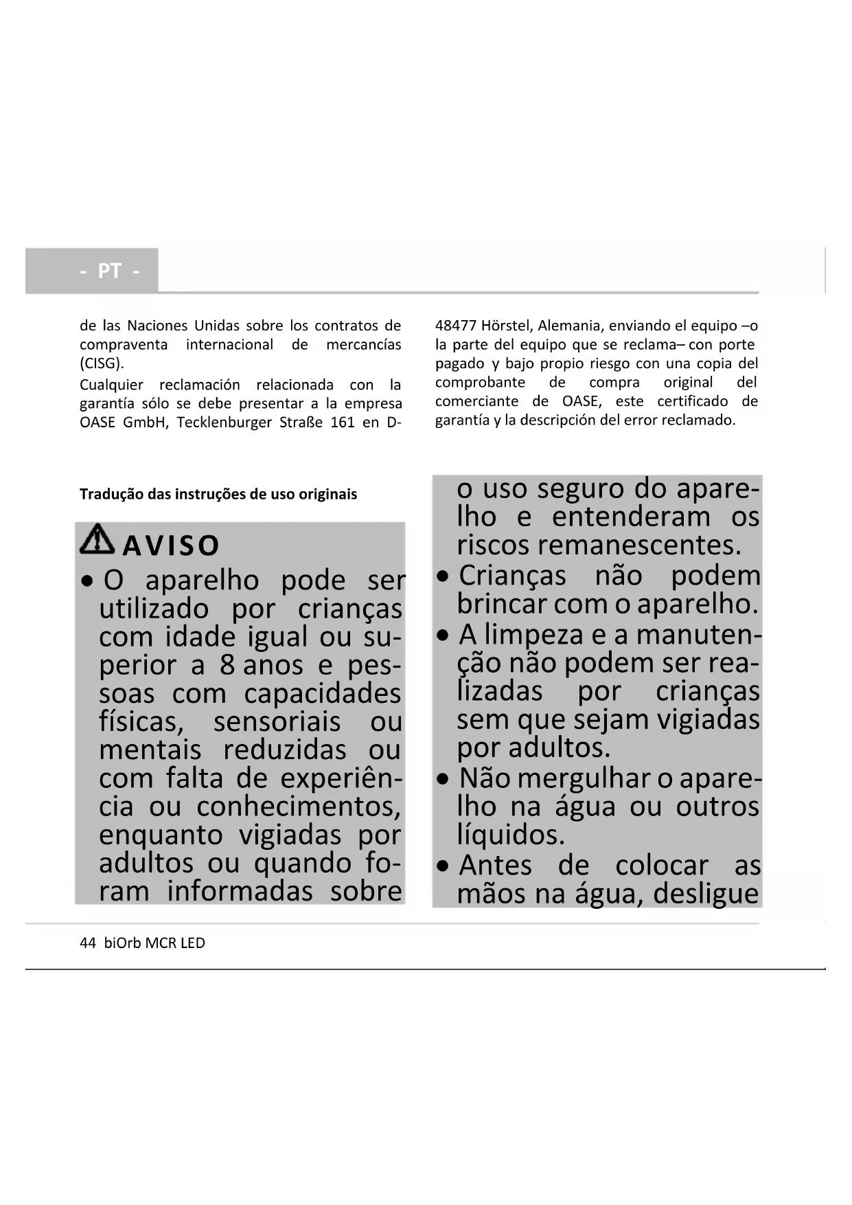 vigência do período de garantia tem início com a primeira aquisição do aparelho num dos centros de distribuição OASE. O período de garantia não será reiniciado após a revenda do produto. O pe- ríodo de garantia não será prorrogado nem res- tabelecido por serviços cobertos pela garantia. Os seus direitos legais enquanto adquirente, de- signadamente com respeito à garantia legal, não serão afectados nem reduzidos por esta garantia voluntária. Condições de garantia voluntária A OASE GmbH garante a boa qualidade con- forme o fim de utilização previsto, a montagem correcta e o funcionamento perfeito. A garantia refere-se, a critério do fabricante, à reparação gratuita ou o fornecimento gratuito de peças de reposição ou de um aparelho em substituição do defeituoso. Caso o tipo do aparelho defeituoso deixe de ser produzido, reservamo-nos o direito de fornecer, do nosso sortido, um aparelho em substituição do defeituoso e que se aproxime o mais perto possível do tipo anterior. As reclama- ções que tenham a sua origem numa instalação deficiente, operação incorrecta ou cuidados in- suficientes (por exemplo, utilização de detergen- tes inadequados), falta de manutenção, utiliza- ção incorrecta, danos provocados por acidentes, quedas, choques, geada, separação da ficha eléctrica, redução do comprimento do cabo eléc- trico, depósitos calcários, tentativas de repara- ção indevidas, não estão cobertas pela presente garantia voluntária. Leia e observe as instruções de serviço em anexo que fazem parte da garan- tia. As peças sujeitas a desgaste permanente, por exemplo, lâmpadas, não estão abrangidas pela garantia. O reembolso das despesas de montagem e des- montagem, verificações, a indemnização por perdas de benefícios ou danos estão excluídos da garantia. Isto é extensivo a danos ou prejuízos consequenciais de qualquer natureza, causados pelo aparelho ou pela sua utilização. A garantia será apenas válida num país na qual o aparelho for adquirido a um distribuidor OASE. A legislação alemã rege a presente garantia sob ex- clusão da Convenção das Nações Unidas sobre Contratos de Aquisição Internacional de Merca- dorias (CISG). Eventuais reclamações cobertas pela Garantia poderão ser dirigidas só à OASE GmbH, Tecklen- burger Straße 161, D-48477 Hörstel, Alemanha, enviando, a porte pago e com risco de transporte suportado pelo remetente, o aparelho ou com- ponente defeituoso, incluindo o talão original do revendedor OASE, este Certificado de garantia e a descrição da falha reclamada.- IT -