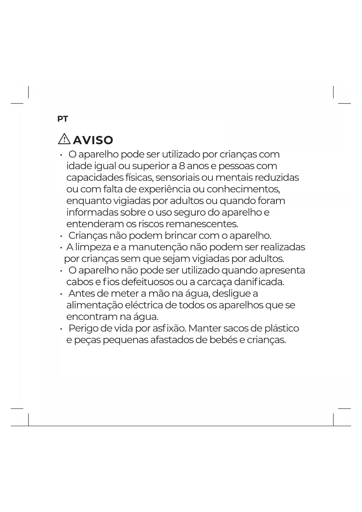 - O aparelho pode ser utilizado por crianças com idade igual ou superior a 8 anos e pessoas com capacidades físicas, sensoriais ou mentais reduzidas ou com falta de experiência ou conhecimentos, enquanto vigiadas por adultos ou quando foram informadas sobre o uso seguro do aparelho e entenderam os riscos remanescentes.