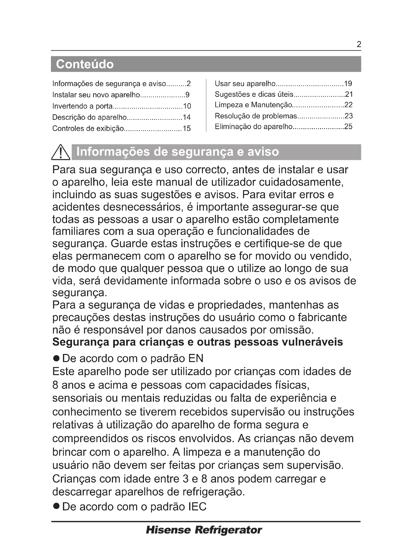 De acordo com o padrão EN Este aparelho pode ser utilizado por crianças com idades de 8 anos e acima e pessoas com capacidades físicas, sensoriais ou mentais reduzidas ou falta de experiência e conhecimento se tiverem recebidos supervisão ou instruções relativas à utilização do aparelho de forma segura e compreendidos os riscos envolvidos. As crianças não devem brincar com o aparelho. A limpeza e a manutenção do usuário não devem ser feitas por crianças sem supervisão. Crianças com idade entre 3 e 8 anos podem carregar e descarregar aparelhos de refrigeração.