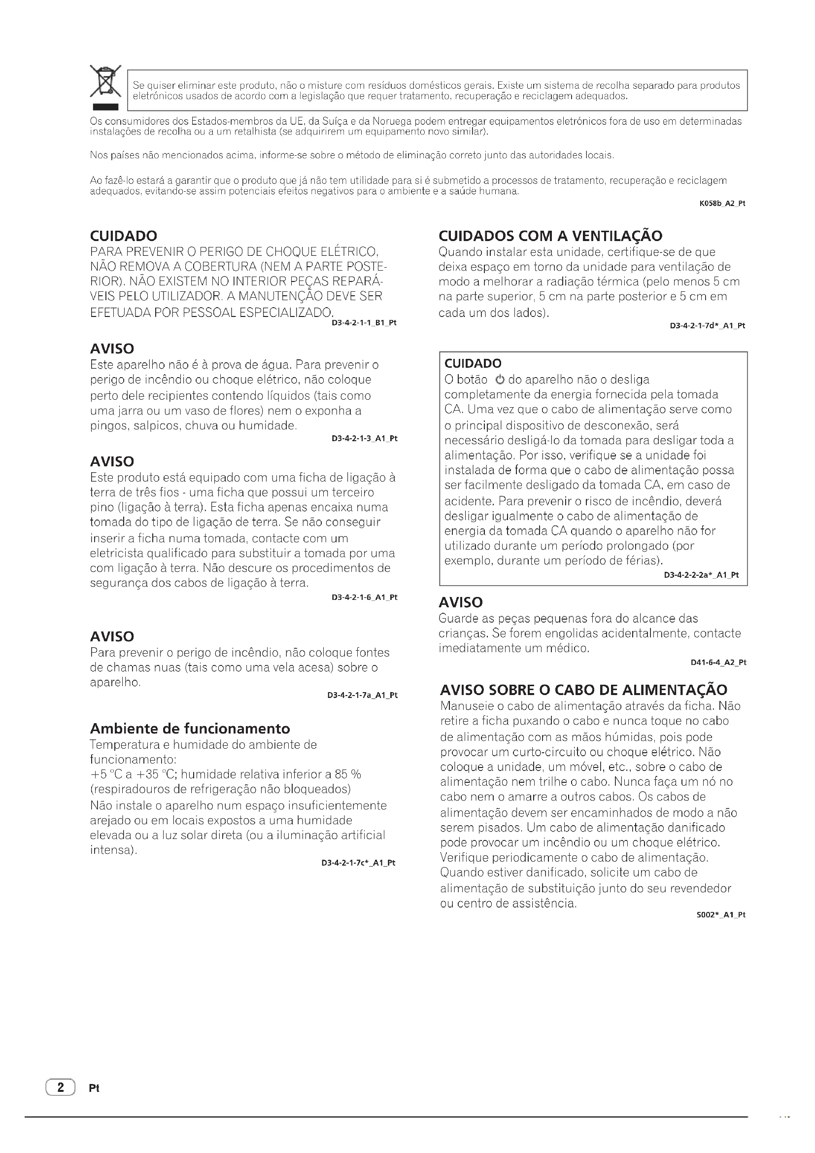 CUIDADO PARA PREVENIR O PERIGO DE CHOQUE ELÉTRICO, NÃO REMOVA A COBERTURA (NEM A PARTE POSTE- RIOR). NÃO EXISTEM NO INTERIOR PEÇAS REPARÁ- VEIS PELO UTILIZADOR. A MANUTENÇÃO DEVE SER EFETUADA POR PESSOAL ESPECIALIZADO. D3-4-2-1-1_B1_Pt AVISO Este aparelho não é à prova de água. Para prevenir o perigo de incêndio ou choque elétrico, não coloque perto dele recipientes contendo líquidos (tais como uma jarra ou um vaso de flores) nem o exponha a pingos, salpicos, chuva ou humidade. D3-4-2-1-3_A1_Pt AVISO Este produto está equipado com uma ficha de ligação à terra de três fios - uma ficha que possui um terceiro pino (ligação à terra). Esta ficha apenas encaixa numa tomada do tipo de ligação de terra. Se não conseguir inserir a ficha numa tomada, contacte com um eletricista qualificado para substituir a tomada por uma com ligação à terra. Não descure os procedimentos de segurança dos cabos de ligação à terra. D3-4-2-1-6_A1_Pt AVISO Para prevenir o perigo de incêndio, não coloque fontes de chamas nuas (tais como uma vela acesa) sobre o aparelho. D3-4-2-1-7a_A1_Pt Ambiente de funcionamento Temperatura e humidade do ambiente de funcionamento: +5 °C a +35 °C; humidade relativa inferior a 85 % (respiradouros de refrigeração não bloqueados) Não instale o aparelho num espaço insuficientemente arejado ou em locais expostos a uma humidade elevada ou a luz solar direta (ou a iluminação artificial intensa). D3-4-2-1-7c*_A1_Pt