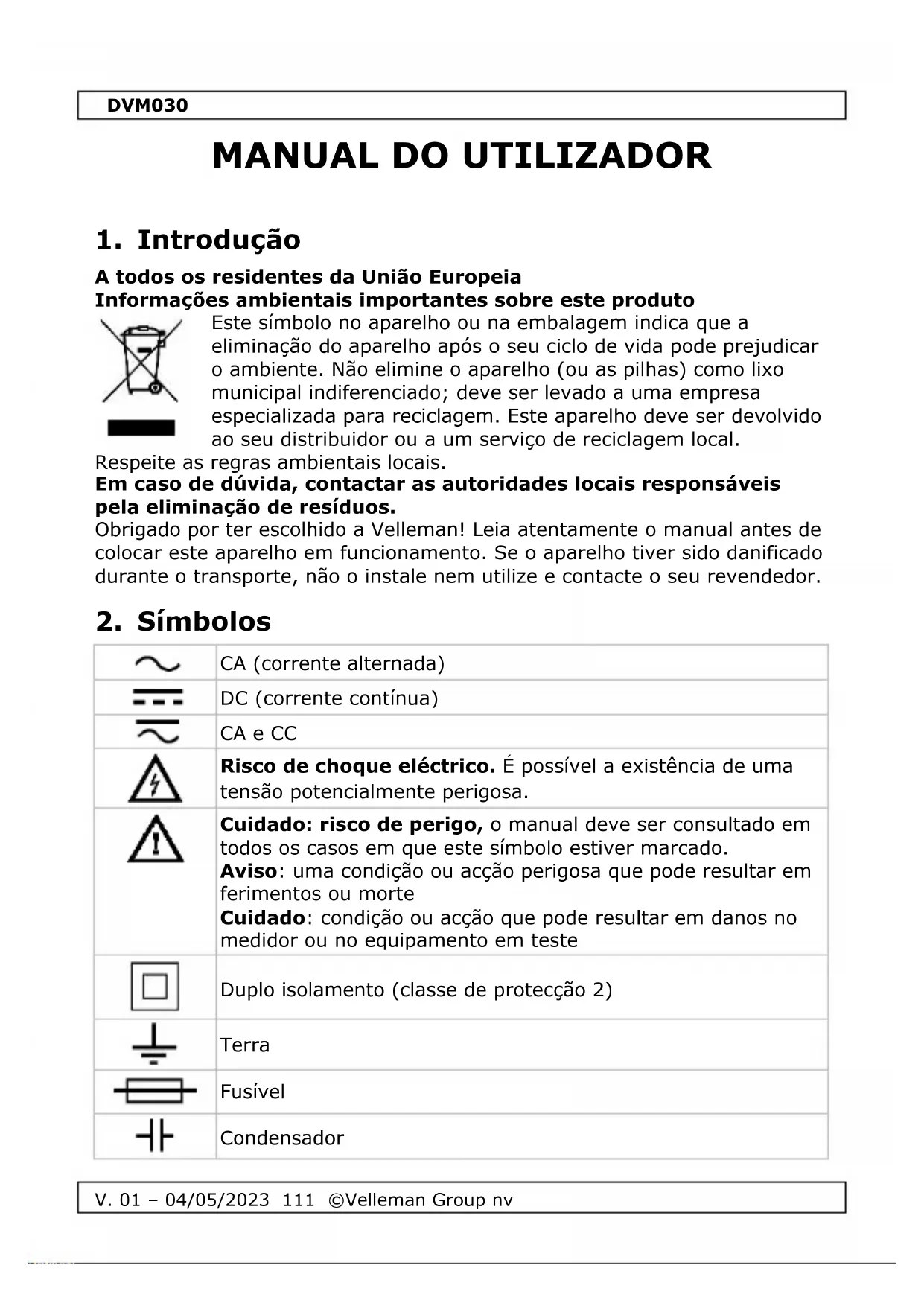 Baixe as instruções para o seu Multímetro em formato PDF gratuitamente! Encontre o seu manual DVM030 - VELLEMAN e retome o controlo do seu dispositivo eletrónico. Nesta página estão publicados todos os documentos necessários para a utilização do seu dispositivo. DVM030 da marca VELLEMAN.