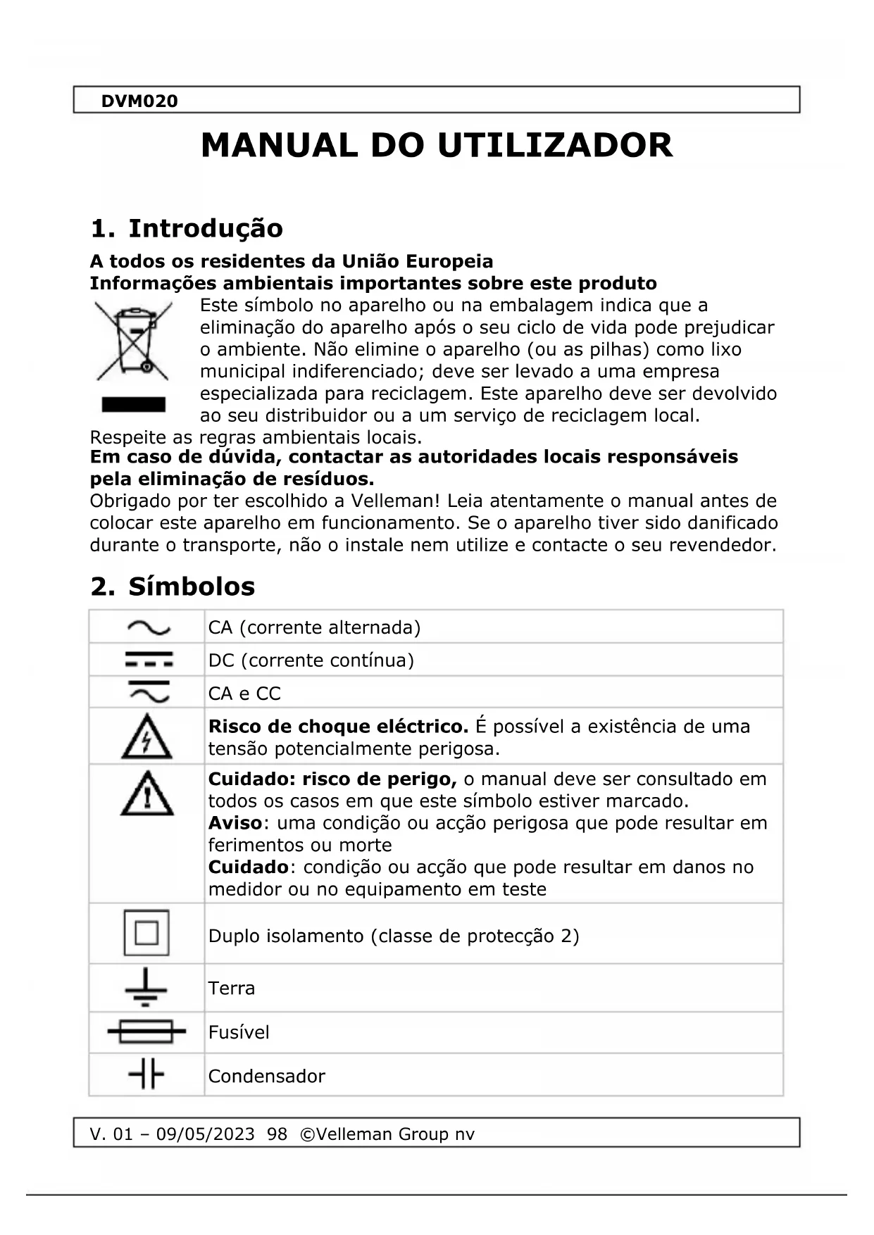 Encontre gratuitamente o manual do aparelho DVM020 VELLEMAN em formato PDF.