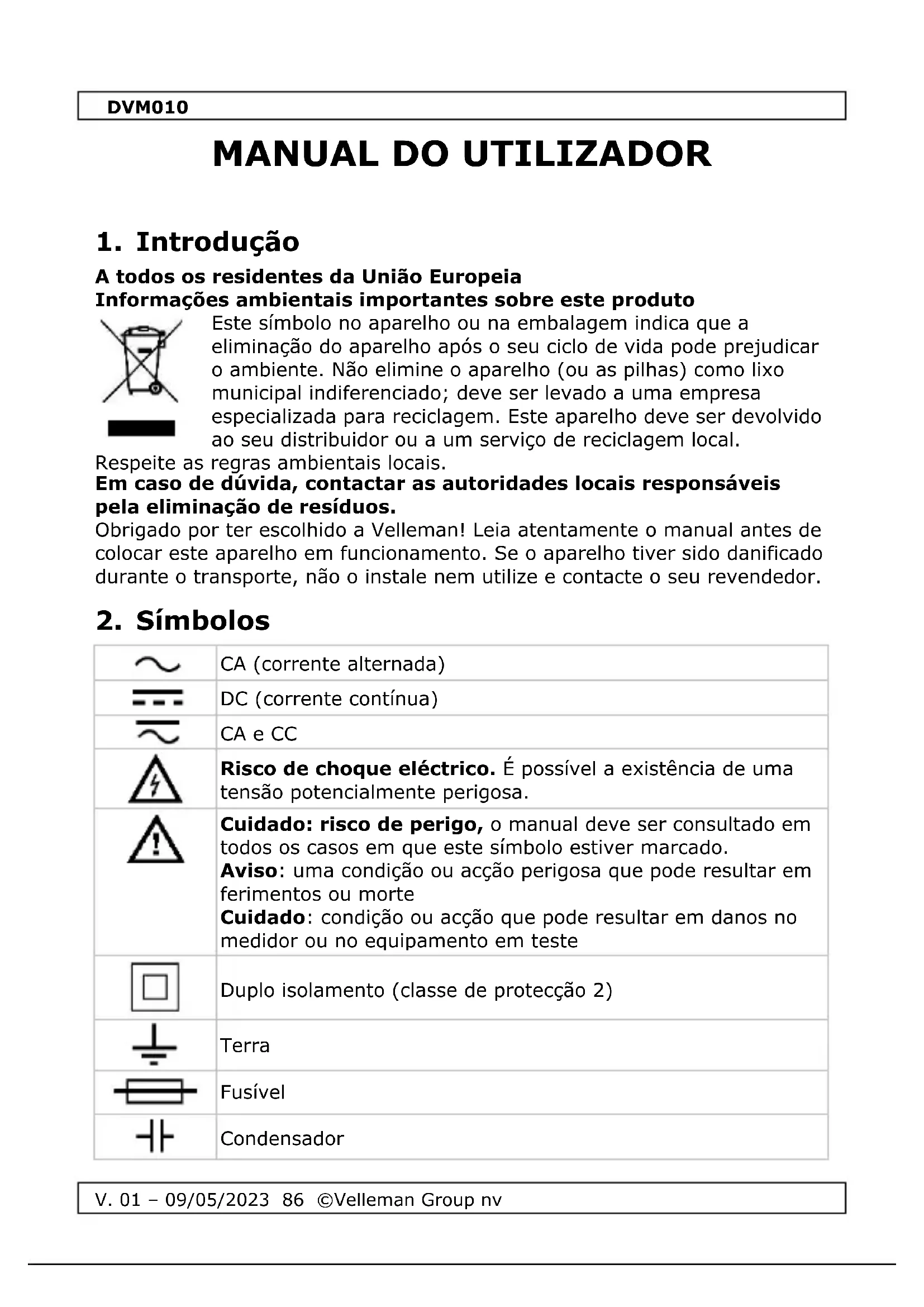 Encontre gratuitamente o manual do aparelho DVM010 VELLEMAN em formato PDF.