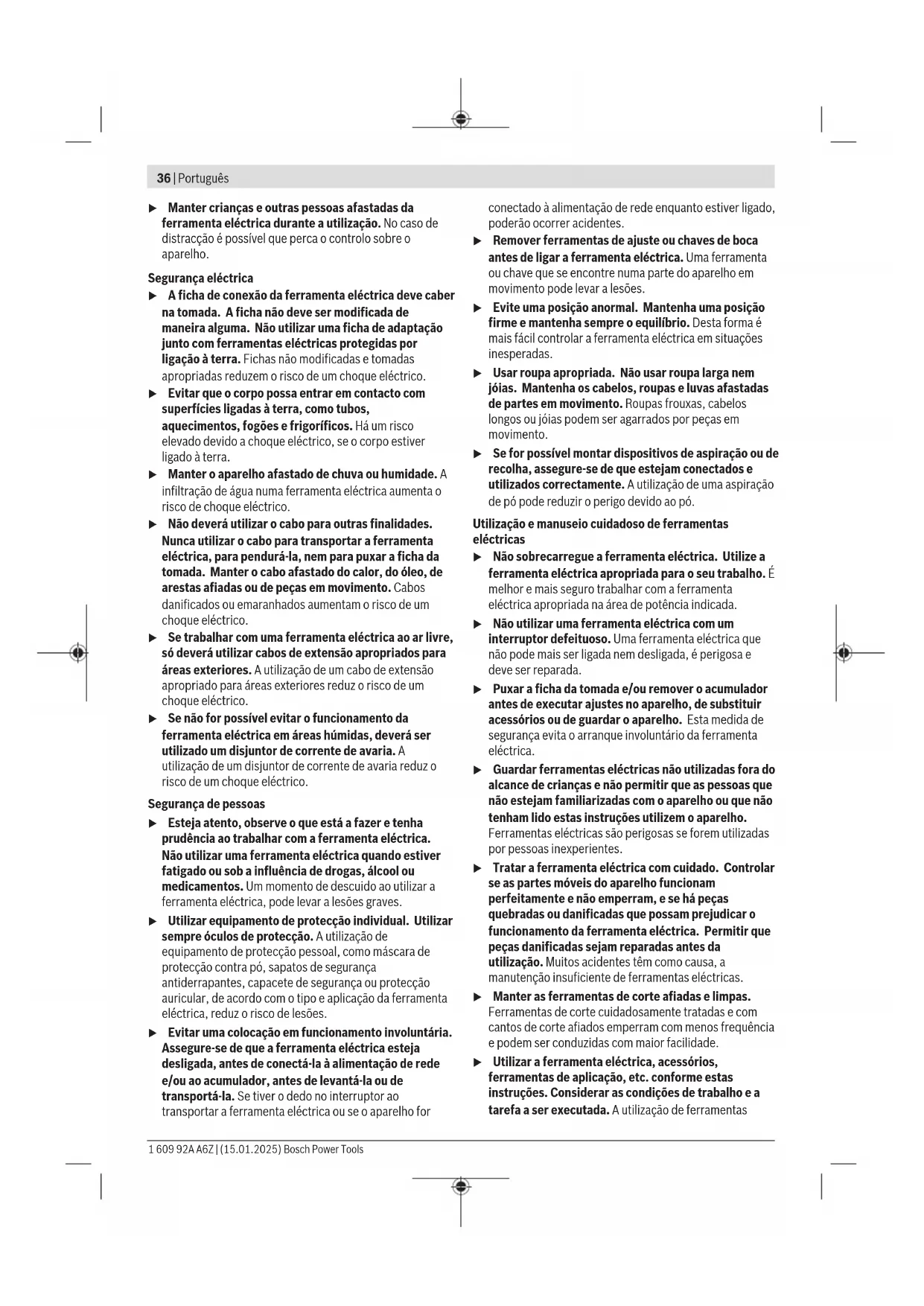 Desconexión de retroceso En el caso de un repentino contragolpe de la herramienta eléctrica, p. ej. bloqueo durante el fresado, se interrumpe electrónicamente la ali- mentación de corriente del motor. Para la nueva puesta en marcha, coloque el interruptor de conexión/desconexión(5) / (11) en la posición de descone- xión y conecte de nuevo la herramienta eléctrica. Protección contra rearranque La protección contra rearranque evita la puesta en marcha accidental de la herramienta eléctrica tras un corte de la ali- mentación eléctrica. Para la nueva puesta en marcha, coloque el interruptor de conexión/desconexión(5) / (11) en la posición de descone- xión y conecte de nuevo la herramienta eléctrica. Indicación: En el caso de una desconexión y reconexión muy rápida, puede ocurrir que se active la protección de rearran- que y no se ponga en marcha la herramienta eléctrica a pe- sar de un interruptor de conexión/desconexión (5)/(11) ac- cionado. Coloque el interruptor de conexión/desconexión (5)/(11) en la posición de desconexión y conecte de nuevo la herramienta eléctrica. Arranque suave El arranque suave reduce el par obtenido en el momento del arranque e incrementa la vida útil del motor. Instrucciones para la operación u Antes de cualquier manipulación en la herramienta eléctrica, sacar el enchufe de red de la toma de co- rriente. u Guarde los útiles abrasivos protegidos contra golpes. u No cargue demasiado la herramienta eléctrica, para que no se llegue a la detención. u Tras una fuerte carga, deje funcionar la herramienta eléctrica unos minutos al régimen de ralentí, para que se enfríe el útil. u Las muelas lijadoras se calientan mucho durante el trabajo. No las toque antes de que se hayan enfriado. Guíe las muelas con un movimiento de vaivén uniforme, ejer- ciendo una leve presión, para conseguir un resultado óptimo en el trabajo. Una presión demasiado fuerte reduce la capa- cidad de rendimiento de la herramienta eléctrica y conduce a un desgaste más rápido del cuerpo abrasivo. 1 609 92A A6Z | (15.01.2025) Bosch Power ToolsPortuguês | 35 Mantenimiento y servicio Mantenimiento y limpieza u Antes de cualquier manipulación en la herramienta eléctrica, sacar el enchufe de red de la toma de co- rriente. u Siempre mantenga limpias la herramienta eléctrica y las rejillas de ventilación para trabajar con eficacia y fiabilidad. u Si es posible, utilice siempre un sistema de aspiración en caso de condiciones extremas de aplicación. Sople con frecuencia las rejillas de ventilación y conecte el aparato a través de un interruptor de protección (PRCD). Al trabajar metales puede llegar a acumularse en el interior de la herramienta eléctrica polvo susceptible de conducir corriente. Ello puede mermar la eficacia del aislamiento de la herramienta eléctrica. Guarde y maneje los accesorios cuidadosamente. Si es necesario reemplazar el cable de conexión, entonces esto debe ser realizado por Bosch o por un servicio técnico autorizado para herramientas eléctricas Bosch, para evitar riesgos de seguridad. Servicio técnico y atención al cliente El servicio técnico le asesorará en las consultas que pueda Ud. tener sobre la reparación y mantenimiento de su produc- to, así como sobre piezas de recambio. Los dibujos de des- piece e informaciones sobre las piezas de recambio los po- drá obtener también en: www.bosch-pt.com Nuestro equipo de asesores técnicos le orientará gustosa- mente en cuanto a la adquisición, aplicación y ajuste de los productos y accesorios. Para cualquier consulta o pedido de piezas de repuesto es imprescindible indicar el nº de artículo de 10dígitos que fi- gura en la placa de características del producto. España Robert Bosch España S.L.U. Departamento de ventas Herramientas Eléctricas C/Hermanos García Noblejas, 19 28037 Madrid Para efectuar su pedido online de recambios o pedir la reco- gida para la reparación de su máquina, entre en la página www.herramientasbosch.net. Tel. Asesoramiento al cliente: 902 531 553 Fax: 902 531554 México Robert Bosch, S. de R.L. de C.V. Calle Robert Bosch No.405 C.P. 50071 Zona Industrial, Toluca– Estado de México Tel.: (52) 55 528430-62 Tel.: 800 6271286 www.boschherramientas.com.mx Encontrará más direcciones del servicio técnico en: www.bosch-pt.com/serviceaddresses Eliminación Recomendamos que las herramientas eléctricas, accesorios y embalajes sean sometidos a un proceso de recuperación que respete el medio ambiente. ¡No arroje las herramientas eléctricas a la basu- ra! Sólo para los países de laUE: Las herramientas eléctricas que ya no se puedan utilizar de- ben eliminarse por separado. Utilice los sistemas de recogi- da previstos. Si se eliminan de forma inadecuada, los residuos de apara- tos eléctricos y electrónicos pueden tener efectos nocivos para el medio ambiente y la salud humana debido a la posi- ble presencia de sustancias peligrosas. El símbolo es solamente válido, si también se encuentra sobre la placa de características del producto/fabricado. Português Instruções de segurança Indicações gerais de advertência para ferramentas eléctricas AVISO Devem ser lidas todas as indicações de advertência e todas as instruções. O desrespeito das advertências e instruções apresentadas abaixo pode causar choque eléctrico, incêndio e/ou graves lesões. Guarde bem todas as advertências e instruções para futura referência. O termo "ferramenta eléctrica" utilizado a seguir nas indicações de advertência, refere‑se a ferramentas eléctricas operadas com corrente de rede (com cabo de rede) e a ferramentas eléctricas operadas com acumulador (sem cabo de rede). Segurança da área de trabalho u Mantenha a sua área de trabalho sempre limpa e bem iluminada. Desordem ou áreas de trabalho insuficientemente iluminadas podem levar a acidentes. u Não trabalhar com a ferramenta eléctrica em áreas com risco de explosão, nas quais se 