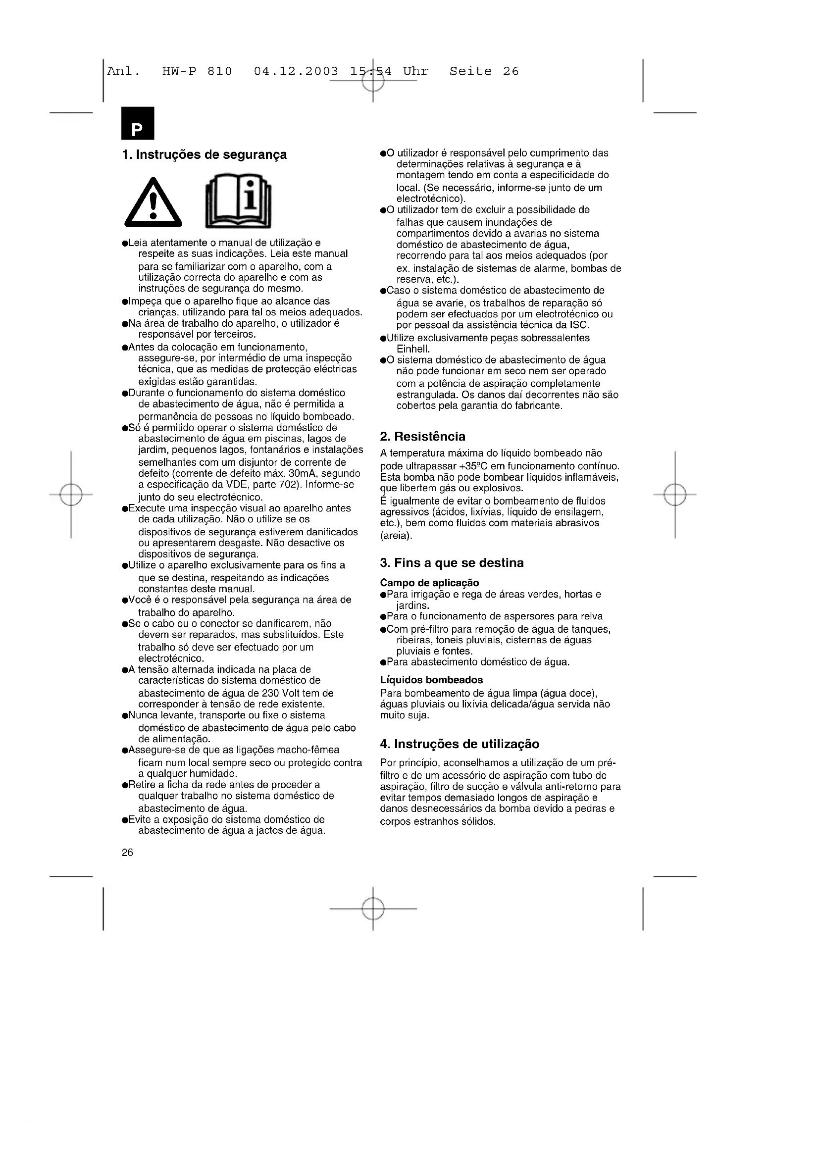Leia atentamente o manual de utilização e respeite as suas indicações. Leia este manual para se familiarizar com o aparelho, com a utilização correcta do aparelho e com as instruções de segurança do mesmo. Impeça que o aparelho fique ao alcance das crianças, utilizando para tal os meios adequados. Na área de trabalho do aparelho, o utilizador é responsável por terceiros. Antes da colocação em funcionamento, assegure-se, por intermédio de uma inspecção técnica, que as medidas de protecção eléctricas exigidas estão garantidas. Durante o funcionamento do sistema doméstico de abastecimento de água, não é permitida a permanência de pessoas no líquido bombeado. Só é permitido operar o sistema doméstico de abastecimento de água em piscinas, lagos de jardim, pequenos lagos, fontanários e instalações semelhantes com um disjuntor de corrente de defeito (corrente de defeito máx. 30mA, segundo a especificação da VDE, parte 702). Informe-se junto do seu electrotécnico. Execute uma inspecção visual ao aparelho antes de cada utilização. Não o utilize se os dispositivos de segurança estiverem danificados ou apresentarem desgaste. Não desactive os dispositivos de segurança. Utilize o aparelho exclusivamente para os fins a que se destina, respeitando as indicações constantes deste manual. Você é o responsável pela segurança na área de trabalho do aparelho. Se o cabo ou o conector se danificarem, não devem ser reparados, mas substituídos. Este trabalho só deve ser efectuado por um electrotécnico. A tensão alternada indicada na placa de características do sistema doméstico de abastecimento de água de 230 Volt tem de corresponder à tensão de rede existente. Nunca levante, transporte ou fixe o sistema doméstico de abastecimento de água pelo cabo de alimentação. Assegure-se de que as ligações macho-fêmea ficam num local sempre seco ou protegido contra a qualquer humidade. Retire a ficha da rede antes de proceder a qualquer trabalho no sistema doméstico de abastecimento de água. Evite a exposição do sistema doméstico de abastecimento de água a jactos de água. O utilizador é responsável pelo cumprimento das determinações relativas à segurança e à montagem tendo em conta a especificidade do local. (Se necessário, informe-se junto de um electrotécnico). O utilizador tem de excluir a possibilidade de falhas que causem inundações de compartimentos devido a avarias no sistema doméstico de abastecimento de água, recorrendo para tal aos meios adequados (por ex. instalação de sistemas de alarme, bombas de reserva, etc.). Caso o sistema doméstico de abastecimento de água se avarie, os trabalhos de reparação só podem ser efectuados por um electrotécnico ou por pessoal da assistência técnica da ISC. Utilize exclusivamente peças sobressalentes Einhell. O sistema doméstico de abastecimento de água não pode funcionar em seco nem ser operado com a potência de aspiração completamente estrangulada. Os danos daí decorrentes não são cobertos pela garantia do fabricante.