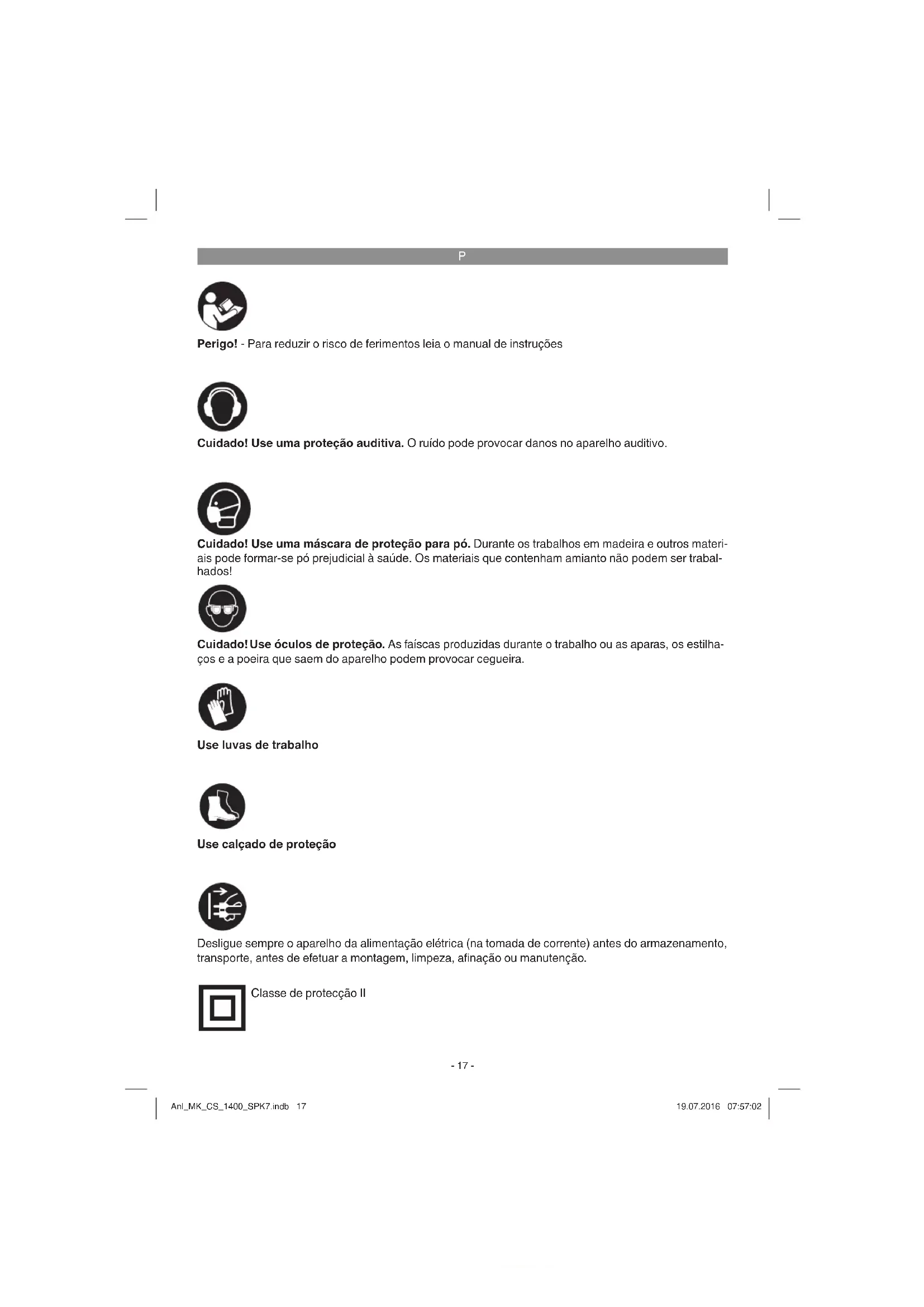 Perigo! - Para reduzir o risco de ferimentos leia o manual de instruções Cuidado! Use óculos de proteção. As faíscas produzidas durante o trabalho ou as aparas, os estilha- ços e a poeira que saem do aparelho podem provocar cegueira. Cuidado! Use uma proteção auditiva. O ruído pode provocar danos no aparelho auditivo. Cuidado! Use uma máscara de proteção para pó. Durante os trabalhos em madeira e outros materi- ais pode formar-se pó prejudicial à saúde. Os materiais que contenham amianto não podem ser trabal- hados! Use luvas de trabalho Use calçado de proteção Desligue sempre o aparelho da alimentação elétrica (na tomada de corrente) antes do armazenamento, transporte, antes de efetuar a montagem, limpeza, afi nação ou manutenção. Classe de protecção II Anl_MK_CS_1400_SPK7.indb 17Anl_MK_CS_1400_SPK7.indb 17 19.07.2016 07:57:0219.07.2016 07:57:02P
