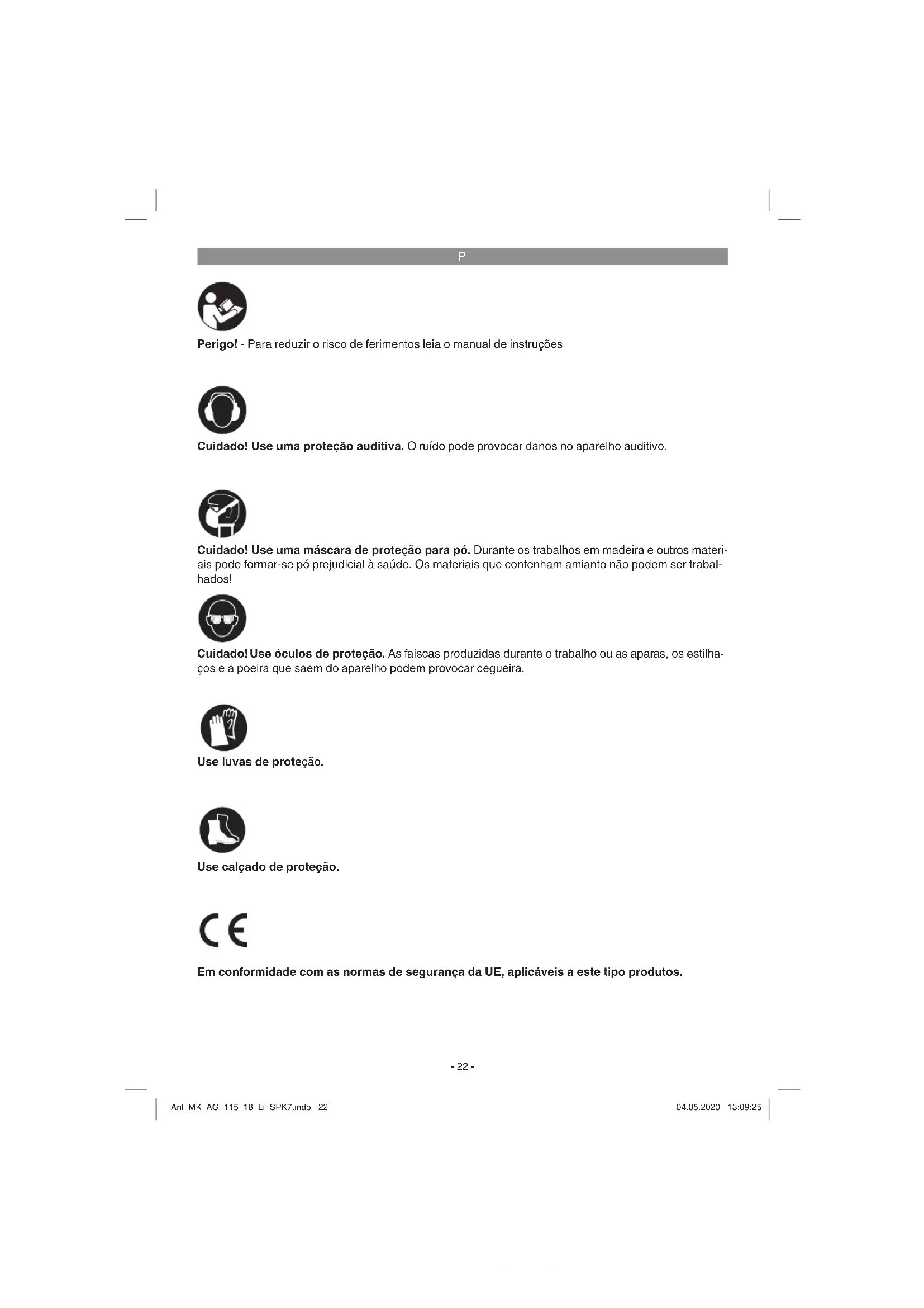 Perigo! - Para reduzir o risco de ferimentos leia o manual de instruções Cuidado! Use uma proteção auditiva. O ruído pode provocar danos no aparelho auditivo. Cuidado! Use óculos de proteção. As faíscas produzidas durante o trabalho ou as aparas, os estilha- ços e a poeira que saem do aparelho podem provocar cegueira. Cuidado! Use uma máscara de proteção para pó. Durante os trabalhos em madeira e outros materi- ais pode formar-se pó prejudicial à saúde. Os materiais que contenham amianto não podem ser trabal- hados! Use calçado de proteção. Use luvas de proteção. Em conformidade com as normas de segurança da UE, aplicáveis a este tipo produtos. Anl_MK_AG_115_18_Li_SPK7.indb 22Anl_MK_AG_115_18_Li_SPK7.indb 22 04.05.2020 13:09:2504.05.2020 13:09:25P