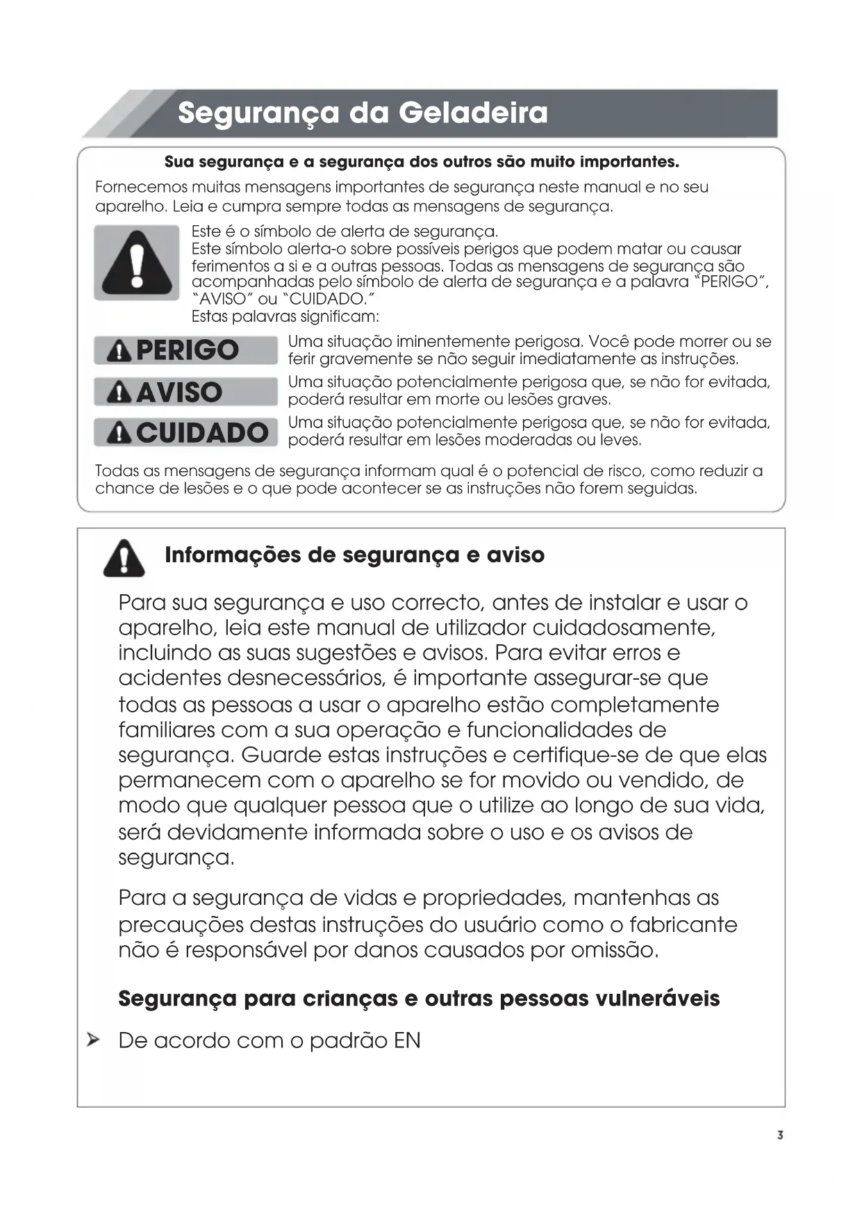 ...........................................................................................Sua segurança e a segurança dos outros são muito importantes. Segurança da Geladeira Fornecemos muitas mensagens importantes de segurança neste manual e no seu aparelho. Leia e cumpra sempre todas as mensagens de segurança. Este é o símbolo de alerta de segurança. Este símbolo alerta-o sobre possíveis perigos que podem matar ou causar ferimentos a si e a outras pessoas. Todas as mensagens de segurança são acompanhadas pelo símbolo de alerta de segurança e a palavra “PERIGO”, “AVISO” ou “CUIDADO.” Estas palavras significam: Uma situação iminentemente perigosa. Você pode morrer ou se ferir gravemente se não seguir imediatamente as instruções. PERIGO AVISO CUIDADO Uma situação potencialmente perigosa que, se não for evitada, poderá resultar em morte ou lesões graves. Uma situação potencialmente perigosa que, se não for evitada, poderá resultar em lesões moderadas ou leves. Todas as mensagens de segurança informam qual é o potencial de risco, como reduzir a chance de lesões e o que pode acontecer se as instruções não forem seguidas. Informações de segurança e aviso Para sua segurança e uso correcto, antes de instalar e usar o aparelho, leia este manual de utilizador cuidadosamente, incluindo as suas sugestões e avisos. Para evitar erros e acidentes desnecessários, é importante assegurar-se que todas as pessoas a usar o aparelho estão completamente familiares com a sua operação e funcionalidades de segurança. Guarde estas instruções e certifique-se de que elas permanecem com o aparelho se for movido ou vendido, de modo que qualquer pessoa que o utilize ao longo de sua vida, será devidamente informada sobre o uso e os avisos de segurança. Para a segurança de vidas e propriedades, mantenhas as precauções destas instruções do usuário como o fabricante não é responsável por danos causados por omissão. Segurança para crianças e outras pessoas vulneráveis De acordo com o padrão ENEste aparelho pode ser utilizado por crianças com idade igual ou superior a 8 anos e pessoas com capacidades físicas, sensoriais ou mentais reduzidas ou falta de experiência e conhecimento, se tiverem recebido supervisão ou instruções relativas ao uso do aparelho de forma segura e que tenham compreensão dos riscos envolvidos. As crianças não devem brincar com o aparelho. A limpeza e a manutenção do utilizador não devem ser feitas por crianças sem supervisão. Crianças com idade entre 3 e 8 anos podem carregar e descarregar aparelhos de refrigeração. De acordo com o padrão IEC Este aparelho não está destinado a ser usado por pessoas (incluindo crianças) com capacidades físicas, sensoriais ou mentais reduzidas ou falta de experiência e conhecimento, a não ser que tenham supervisão ou instruções relativas ao uso deste aparelho por uma pessoa responsável pela sua segurança. Crianças devem ser supervisionadas para garantir que não brinquem com o aparelho. Mantenha todas as embalagens fora do alcance das crianças porque há o risco de asfixia. Se for eliminar o aparelho, puxe a ficha para fora da tomada, corte o cabo de conexão (tão perto do aparelho quanto possível) e remova a porta para prevenir que crianças a brincar sofram de choques eléctricos ou se fechem dentro. Se este aparelho, com selos de porta magnética, é para substituir um aparelho antigo com fechos de mola (trava) na porta ou tampa, assegure-se que os fechos de mola são inutilizáveis antes de eliminar o aparelho antigo. Isto irá prevenir que o aparelho se torne uma armadilha fatal para uma criança. Segurança geral Este aparelho destina-se a ser utilizado em aplicações domésticas e similares, tais como: -áreas de cozinha em lojas, escritórios e outros ambientes de trabalho;-casas de quintas e por clientes em hotéis, motéis e outros ambientes de tipo residencial; -ambientes do tipo de cama e café da manhã; -restauração e aplicações similares não varejistas. Não armazene substâncias explosivas, como latas de aerossol com um propelente inflamável neste aparelho. Se o cabo de alimentação estiver danificado, ele deve ser substituído pelo fabricante, seu agente de serviço ou pessoas qualificadas para evitar um perigo. AVISO — Mantenha a ventilação aberta, no gabinete do aparelho ou na estrutura incorporada, sem obstrução. AVISO — Não utilize dispositivos mecânicos ou outros meios para acelerar o processo de descongelação, exceto os recomendados pelo fabricante. AVISO — Não danifique o circuito de refrigeração. AVISO — Não utilize aparelhos eléctricos no interior dos compartimentos de armazenamento de alimentos do aparelho, a menos que sejam do tipo recomendado pelo fabricante. O refrigerante e o gás de sopro de isolamento são inflamáveis. Ao descartar o aparelho, faça a eliminação apenas num centro de eliminação de resíduos autorizada. Não exponha-o ao fogo. AVISO — Ao posicionar o aparelho, assegure-se que o cabo de alimentação não está preso ou danificado. AVISO — Encha com água potável apenas para o reservatório de água. AVISO — Não coloque várias saídas de tomada portátil ou fontes de energia portáteis atrás do aparelho.Substituir o LED AVISO — A luz LED não deve ser substituída pelo usuário! Se a luz do LED estiver danificada, entre em contato com a linha de atendimento ao cliente para obter assistência. Refrigerante O refrigerante isobuteno (R600a) está contido no circuito refrigerante do aparelho, um gás natural com um alto nível de compatibilidade ambiental, que é, no entanto, inflamável. Durante o transporte e a instalação do aparelho, certifique-se de que nenhum dos componentes do circuito refrigerante seja danificado. O refrigerante (R600a) é inflamável. AVISO — Refrigeradores contêm refrigerante e gases na isolação. Refrigerante e gases devem ser eliminados pro