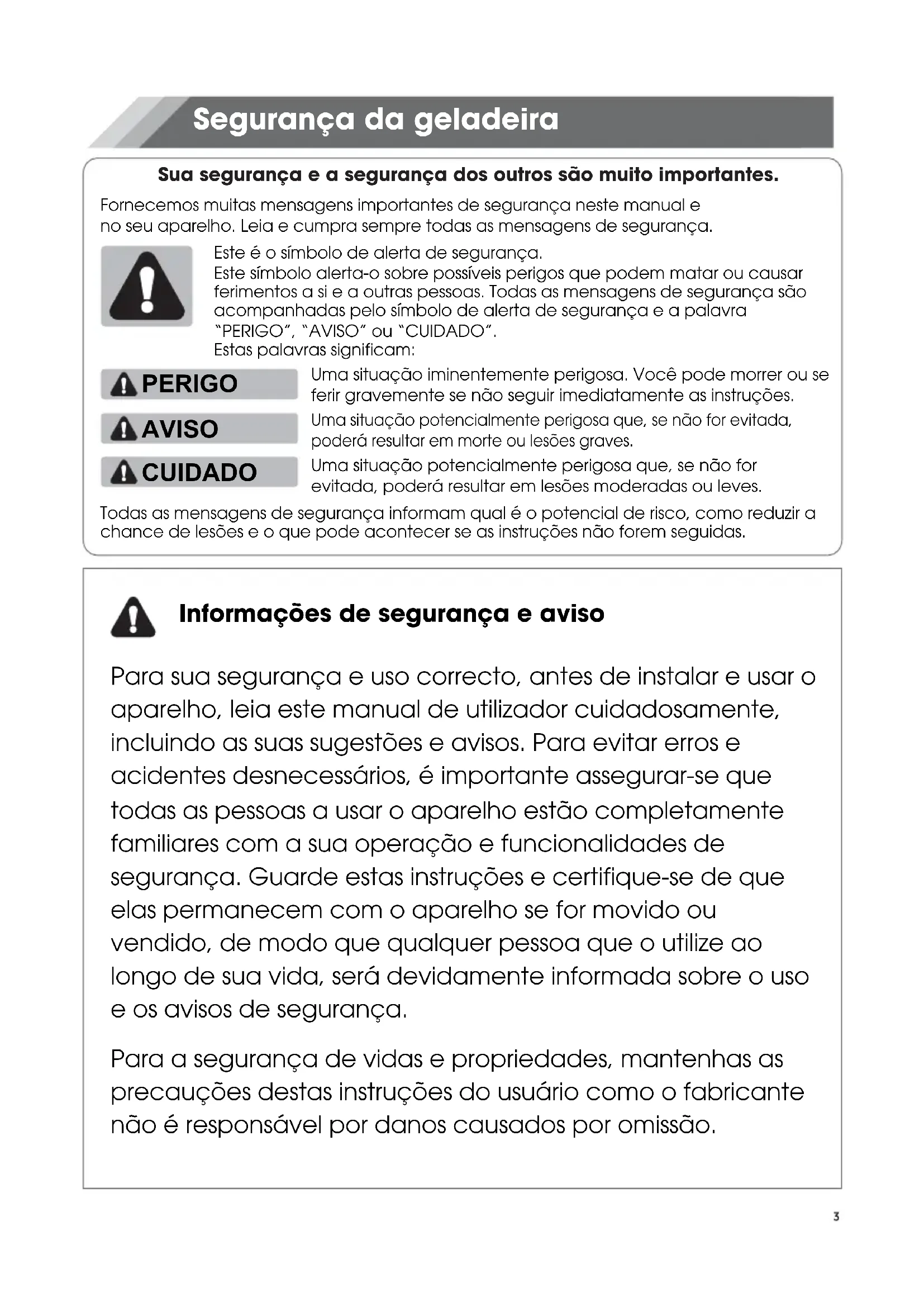 29Sua segurança e a segurança dos outros são muito importantes. Segurança da geladeira Fornecemos muitas mensagens importantes de segurança neste manual e no seu aparelho. Leia e cumpra sempre todas as mensagens de segurança. Este é o símbolo de alerta de segurança. Este símbolo alerta-o sobre possíveis perigos que podem matar ou causar ferimentos a si e a outras pessoas. Todas as mensagens de segurança são acompanhadas pelo símbolo de alerta de segurança e a palavra “PERIGO”, “AVISO” ou “CUIDADO”. Estas palavras significam: PERIGO AVISO CUIDADO Uma situação iminentemente perigosa. Você pode morrer ou se ferir gravemente se não seguir imediatamente as instruções. Uma situação potencialmente perigosa que, se não for evitada, poderá resultar em morte ou lesões graves. Uma situação potencialmente perigosa que, se não for evitada, poderá resultar em lesões moderadas ou leves. Todas as mensagens de segurança informam qual é o potencial de risco, como reduzir a chance de lesões e o que pode acontecer se as instruções não forem seguidas. Informações de segurança e aviso Para sua segurança e uso correcto, antes de instalar e usar o aparelho, leia este manual de utilizador cuidadosamente, incluindo as suas sugestões e avisos. Para evitar erros e acidentes desnecessários, é importante assegurar-se que todas as pessoas a usar o aparelho estão completamente familiares com a sua operação e funcionalidades de segurança. Guarde estas instruções e certifique-se de que elas permanecem com o aparelho se for movido ou vendido, de modo que qualquer pessoa que o utilize ao longo de sua vida, será devidamente informada sobre o uso e os avisos de segurança. Para a segurança de vidas e propriedades, mantenhas as precauções destas instruções do usuário como o fabricante não é responsável por danos causados por omissão.Segurança para crianças e outras pessoas vulneráveis De acordo com o padrão EN Este aparelho pode ser utilizado por crianças com idades de 8 anos e acima e pessoas com capacidades físicas, sensoriais ou mentais reduzidas ou falta de experiência e conhecimento se tiverem recebidos supervisão ou instruções relativas à utilização do aparelho de forma segura e compreendidos os riscos envolvidos. As crianças não devem brincar com o aparelho. A limpeza e a manutenção do utilizador não devem ser feitas por crianças sem supervisão. Crianças com idade entre 3 e 8 anos podem carregar e descarregar aparelhos de refrigeração. De acordo com o padrão IEC Este aparelho não está destinado a ser usado por pessoas (incluindo crianças) com capacidades físicas, sensoriais ou mentais reduzidas ou falta de experiência e conhecimento, a não ser que tenham supervisão ou instruções relativas ao uso deste aparelho por uma pessoa responsável pela sua segurança. Crianças devem ser supervisionadas para garantir que não brinquem com o aparelho. Mantenha todas as embalagens fora do alcance das crianças porque há o risco de asfixia. Se for eliminar o aparelho, puxe a ficha para fora da tomada, corte o cabo de conexão (tão perto do aparelho quanto possível) e remova a porta para prevenir que crianças a brincar sofram de choques eléctricos ou se fechem dentro. Se este aparelho, com selos de porta magnética, é para substituir um aparelho antigo com fechos de mola na porta ou tampa, assegure-se que os fechos de mola são inutilizáveis antes de eliminar o aparelho antigo. Isto irá prevenir que o aparelho se torne uma armadilha fatal para uma criança.Segurança geral Este aparelho destina-se a ser utilizado em aplicações domésticas e similares, tais como: -áreas de cozinha de funcionários em lojas, escritórios e outros ambientes de trabalho; -casas de quintas e por clientes em hotéis, motéis e outros ambientes de tipo residencial; -ambientes do tipo de cama e café da manhã; -restauração e aplicações similares não varejistas. Não armazene substâncias explosivas, como latas de aerossol com um propelente inflamável neste aparelho. Se o cabo de alimentação estiver danificado, ele deve ser substituído pelo fabricante, seu agente de serviço ou pessoas qualificadas para evitar um perigo. AVISO — Mantenha a ventilação aberta, no gabinete do aparelho ou na estrutura incorporada, sem obstrução. AVISO — Não utilize dispositivos mecânicos ou outros meios para acelerar o processo de descongelação, exceto os recomendados pelo fabricante. AVISO — Não danifique o circuito de refrigeração. AVISO — Não utilize aparelhos eléctricos no interior dos compartimentos de armazenamento de alimentos do aparelho, a menos que sejam do tipo recomendado pelo fabricante. O refrigerante e o gás de sopro de isolamento são inflamáveis. Ao descartar o aparelho, faça a eliminação apenas num centro de eliminação de resíduos autorizada. Não exponha-o ao fogo. AVISO — Ao posicionar o aparelho, assegure-se que o cabo de alimentação não está preso ou danificado. AVISO — Encha com água potável apenas para o reservatório de água.AVISO — Não coloque várias saídas de tomada portátil ou fontes de energia portáteis atrás do aparelho. Substituir o LED AVISO — A luz LED não deve ser substituída pelo usuário! Se a luz do LED estiver danificada, entre em contato com a linha de atendimento ao cliente para obter assistência. Refrigerante O refrigerante isobuteno (R600a) está contido no circuito refrigerante do aparelho, um gás natural com um alto nível de compatibilidade ambiental, que é, no entanto, inflamável. Durante o transporte e a instalação do aparelho, certifique-se de que nenhum dos componentes do circuito refrigerante seja danificado. O refrigerante (R600a) é inflamável. AVISO — Refrigeradores contêm refrigerante e gases na isolação. Refrigerante e gases devem ser eliminados profissionalmente pois podem causar danos oculares ou ignições. Assegure-se que a tubagem d
