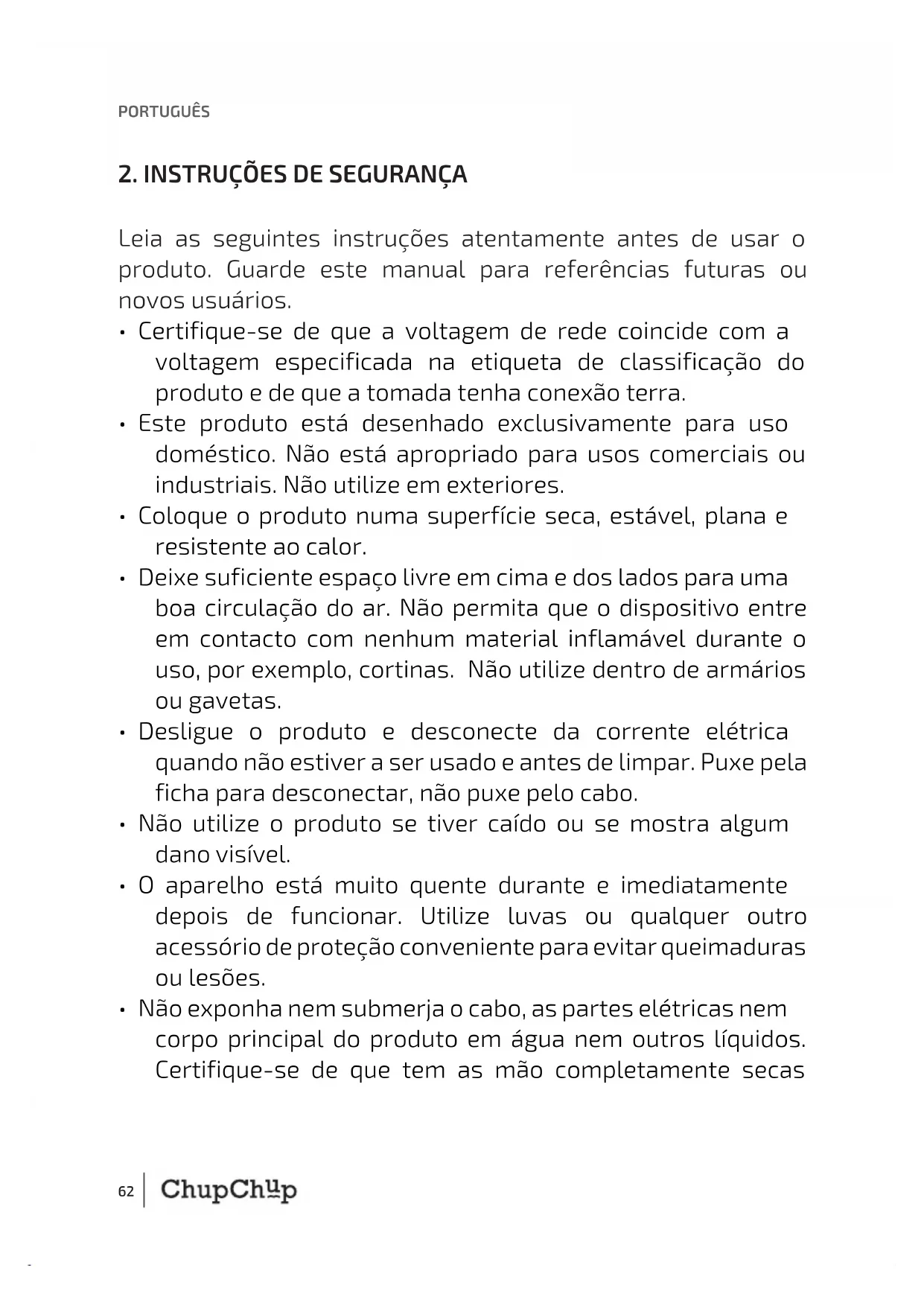 - Não exponha nem submerja o cabo, as partes elétricas nem corpo principal do produto em água nem outros líquidos. Certifique-se de que tem as mão completamente secasPORTUGUÊS