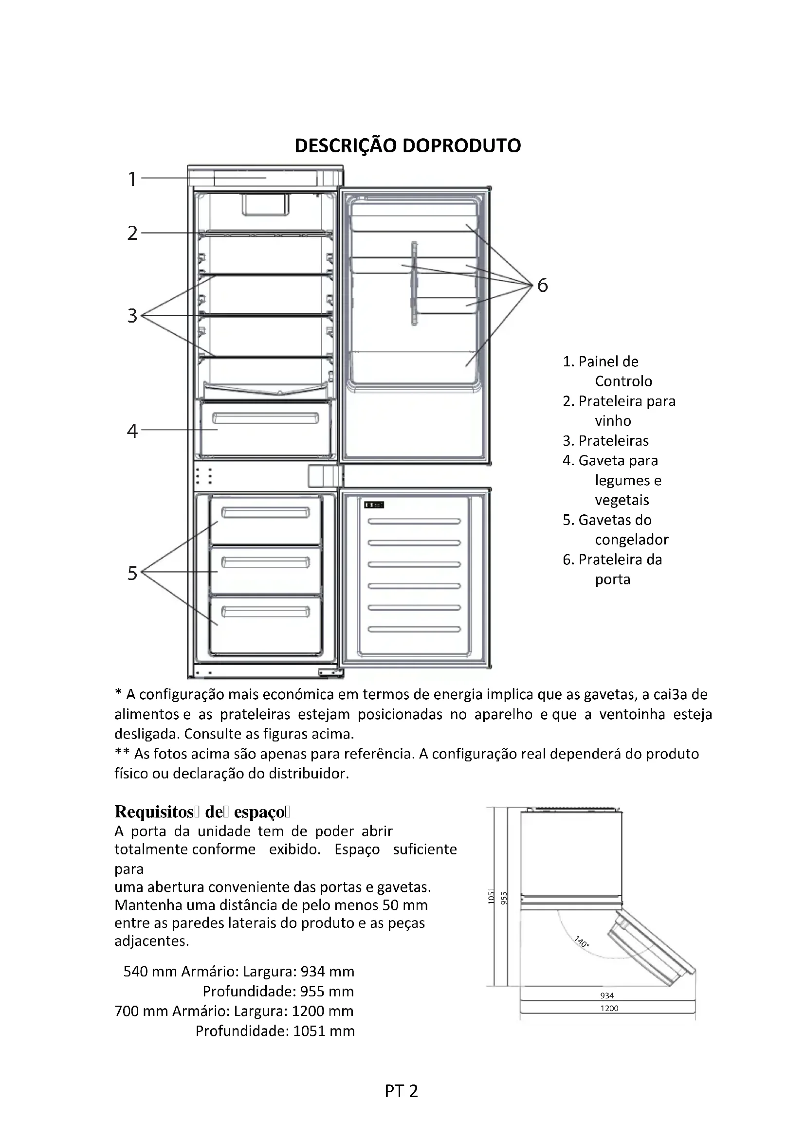 - A configuração mais económica em termos de energia implica que as gavetas, a cai3a de alimentos e as prateleiras estejam posicionadas no aparelho e que a ventoinha esteja desligada. Consulte as figuras acima. ** As fotos acima são apenas para referência. A configuração real dependerá do produto físico ou declaração do distribuidor. Requisitos de espaço A porta da unidade tem de poder abrir totalmente conforme exibido. Espaço suficiente para uma abertura conveniente das portas e gavetas. Mantenha uma distância de pelo menos 50 mm entre as paredes laterais do produto e as peças adjacentes. 540 mm Armário: Largura: 934 mm Profundidade: 955 mm 700 mm Armário: Largura: 1200 mm Profundidade: 1051 mm