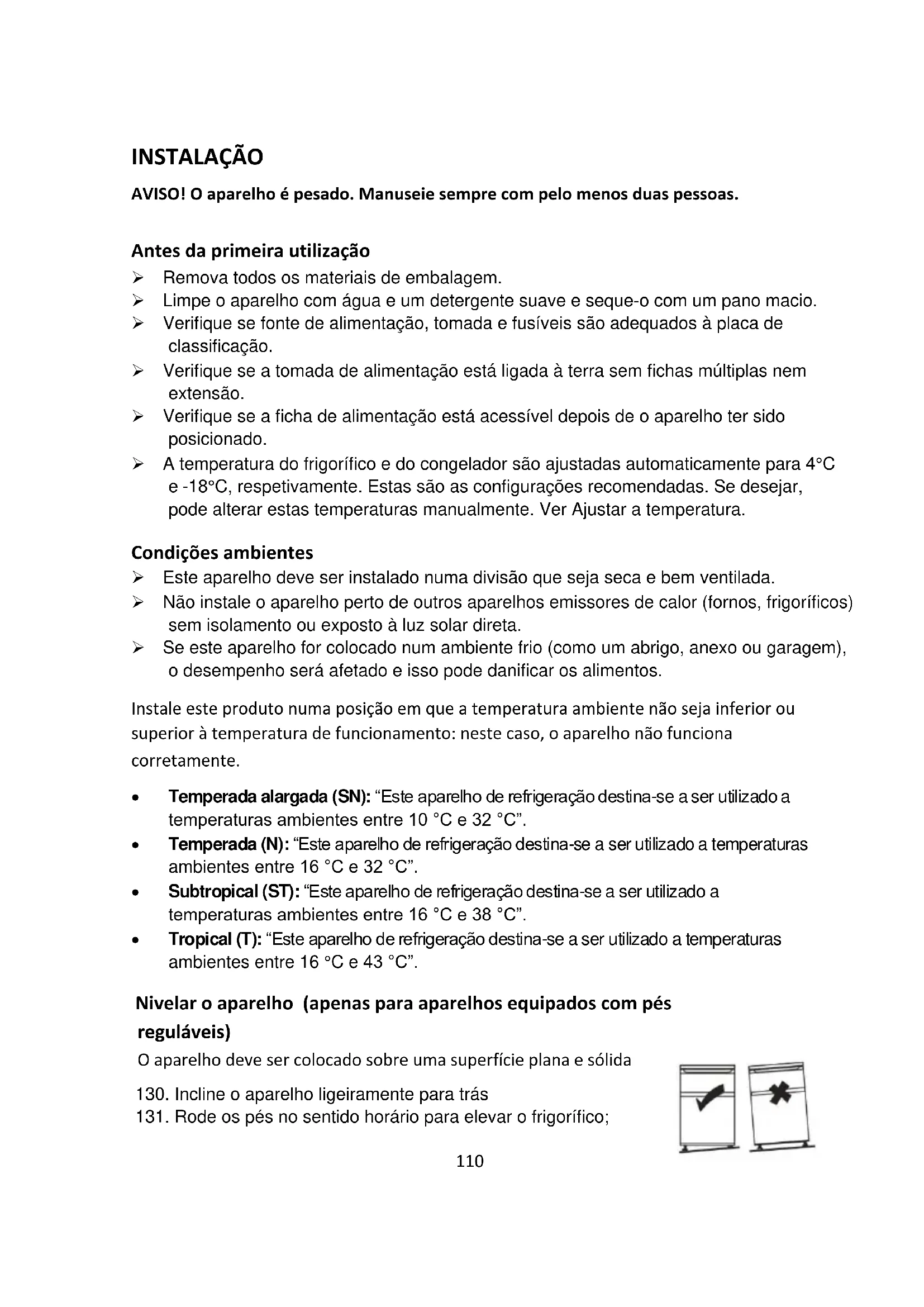 - Tropical (T): “Este aparelho de refrigeração destina-se a ser utilizado a temperaturas ambientes entre 16 °C e 43 °C”. Nivelar o aparelho (apenas para aparelhos equipados com pés reguláveis) O aparelho deve ser colocado sobre uma superfície plana e sólida