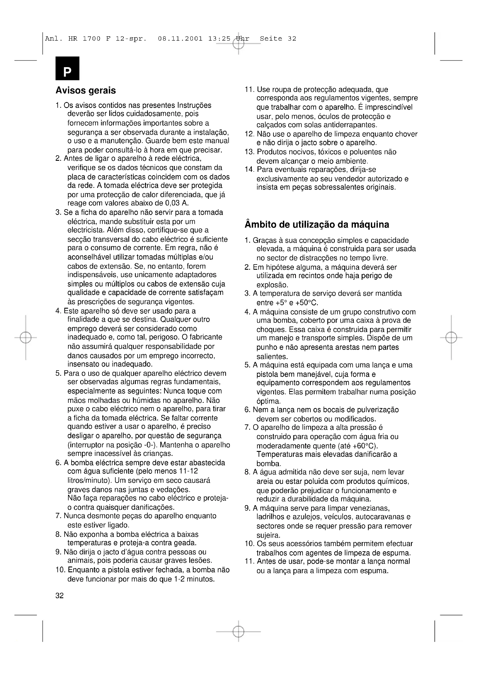 Juntas das válvulas com desgaste Juntas com desgaste Filtro entupido Aspiração de ar Válvulas com desgaste, sujas ou entupidas Mancais com desgaste Temperatura elevada demais da água Filtro sujo Juntas com desgaste Junta tórica das vedações com desgaste A tensão eléctrica é abaixo do valor mínimo A bomba está travada ou gelada O cabo eléctrico de extensão tem dimensões insuficientes Controle se a ficha funciona correctamente Faça girar o motor com a mão Deixe esfriar o motor Mantenha a lança aberta Limpe o filtro Controle as peças de conexão de aspiração e da mangueira Limpe ou substitua Controle e substitua Controle as peças de conexão de aspiração Limpe e substitua Controle e substitua Controle a tensão eléctrica. Desligue o disjuntor e deixe esfriar por alguns minutos Controle e substitua Substitua o bocal Controle, limpe, substitua Controle e/ou substitua Controle e/ou substitua Controle e/ou substitua Controle os tubos de aspiração Controle, limpe, substitua Controle e/ou substitua Faça baixar a temperatura para menos de 50°C Controle e/ou substitua Substitua a junta Substitua a junta tórica Controle se são alcançados os valores correctos Substitua o cabo de extensão por outro de dimensões suficientes Anl. HR 1700 F 12-spr. 08.11.2001 13:25 Uhr Seite 36Dados técnicos: Pressão efectiva em serviço, máx., bars: 100 Débito máx. litros/min.: 7,5 Ligação à rede: 230 V c.a., 50 Hz Potência do motor, kW: 1,7 Classe de protecção: IP 44 Classe de isolamento: F Admissão de água, máx.°C: 60 (com serviço intermitente) Pressão de admissão de água, máx., bars: 10 Protecção eléctrica, amp.: 16 Regime do motor, rpm: 2800 Protecção do motor: disparador térmico de sobrecarga no enrolamento Peso do aparelho: 7 kg O repuxo é inferior a 20 N O valor de emissão referente ao posto de trabalho é de 79 dB(A).