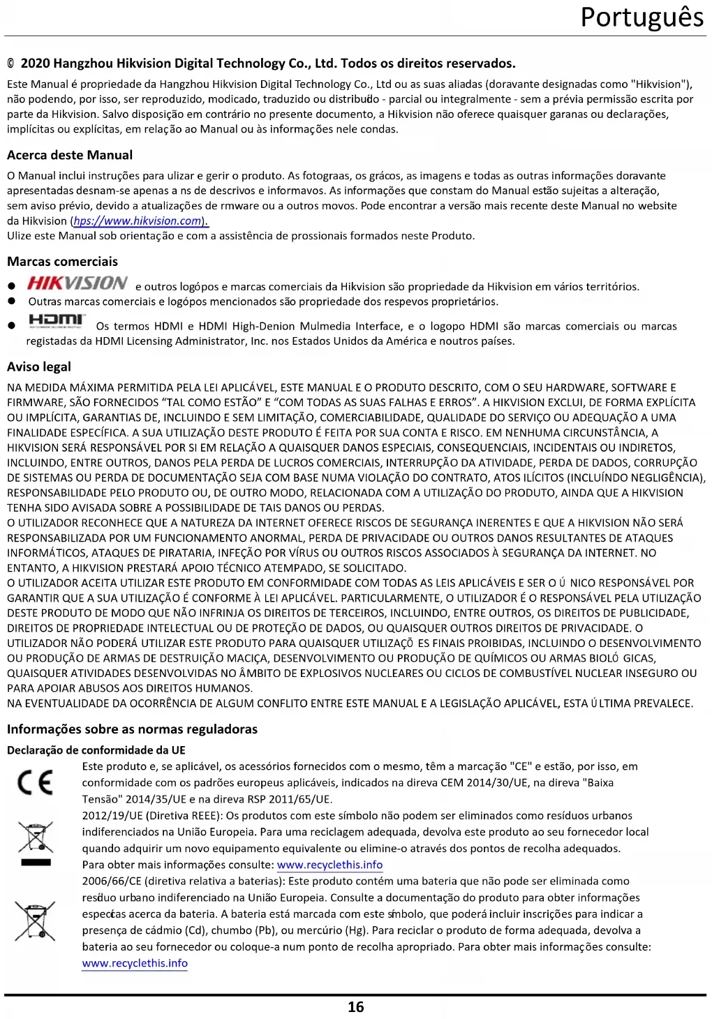 © 2020 Hangzhou Hikvision Digital Technology Co., Ltd. Todos os direitos reservados. Este Manual é propriedade da Hangzhou Hikvision Digital Technology Co., Ltd ou as suas afiliadas (doravante designadas como "Hikvision"), não podendo, por isso, ser reproduzido, modificado, traduzido ou distribuído - parcial ou integralmente - sem a prévia permissão escrita por parte da Hikvision. Salvo disposição em contrário no presente documento, a Hikvision não oferece quaisquer garantias ou declarações, implícitas ou explícitas, em relação ao Manual ou às informações nele contidas. Acerca deste Manual O Manual inclui instruções para utilizar e gerir o produto. As fotografias, os gráficos, as imagens e todas as outras informações doravante apresentadas destinam-se apenas a fins de descritivos e informativos. As informações que constam do Manual estão sujeitas a alteração, sem aviso prévio, devido a atualizações de firmware ou a outros motivos. Pode encontrar a versão mais recente deste Manual no website da Hikvision (https://www.hikvision.com). Utilize este Manual sob orientação e com a assistência de profissionais formados neste Produto. Marcas comerciais e outros logótipos e marcas comerciais da Hikvision são propriedade da Hikvision em vários territórios. Outras marcas comerciais e logótipos mencionados são propriedade dos respetivos proprietários. Os termos HDMI e HDMI High-Definition Multimedia Interface, e o logotipo HDMI são marcas comerciais ou marcas registadas da HDMI Licensing Administrator, Inc. nos Estados Unidos da América e noutros países. Aviso legal NA MEDIDA MÁXIMA PERMITIDA PELA LEI APLICÁVEL, ESTE MANUAL E O PRODUTO DESCRITO, COM O SEU HARDWARE, SOFTWARE E FIRMWARE, SÃO FORNECIDOS “TAL COMO ESTÃO” E “COM TODAS AS SUAS FALHAS E ERROS”. A HIKVISION EXCLUI, DE FORMA EXPLÍCITA OU IMPLÍCITA, GARANTIAS DE, INCLUINDO E SEM LIMITAÇÃO, COMERCIABILIDADE, QUALIDADE DO SERVIÇO OU ADEQUAÇÃO A UMA FINALIDADE ESPECÍFICA. A SUA UTILIZAÇÃO DESTE PRODUTO É FEITA POR SUA CONTA E RISCO. EM NENHUMA CIRCUNSTÂNCIA, A HIKVISION SERÁ RESPONSÁVEL POR SI EM RELAÇÃO A QUAISQUER DANOS ESPECIAIS, CONSEQUENCIAIS, INCIDENTAIS OU INDIRETOS, INCLUINDO, ENTRE OUTROS, DANOS PELA PERDA DE LUCROS COMERCIAIS, INTERRUPÇÃO DA ATIVIDADE, PERDA DE DADOS, CORRUPÇÃO DE SISTEMAS OU PERDA DE DOCUMENTAÇÃO SEJA COM BASE NUMA VIOLAÇÃO DO CONTRATO, ATOS ILÍCITOS (INCLUÍNDO NEGLIGÊNCIA), RESPONSABILIDADE PELO PRODUTO OU, DE OUTRO MODO, RELACIONADA COM A UTILIZAÇÃO DO PRODUTO, AINDA QUE A HIKVISION TENHA SIDO AVISADA SOBRE A POSSIBILIDADE DE TAIS DANOS OU PERDAS. O UTILIZADOR RECONHECE QUE A NATUREZA DA INTERNET OFERECE RISCOS DE SEGURANÇA INERENTES E QUE A HIKVISION NÃO SERÁ RESPONSABILIZADA POR UM FUNCIONAMENTO ANORMAL, PERDA DE PRIVACIDADE OU OUTROS DANOS RESULTANTES DE ATAQUES INFORMÁTICOS, ATAQUES DE PIRATARIA, INFEÇÃO POR VÍRUS OU OUTROS RISCOS ASSOCIADOS À SEGURANÇA DA INTERNET. NO ENTANTO, A HIKVISION PRESTARÁ APOIO TÉCNICO ATEMPADO, SE SOLICITADO. O UTILIZADOR ACEITA UTILIZAR ESTE PRODUTO EM CONFORMIDADE COM TODAS AS LEIS APLICÁVEIS E SER O Ú NICO RESPONSÁVEL POR GARANTIR QUE A SUA UTILIZAÇÃO É CONFORME À LEI APLICÁVEL. PARTICULARMENTE, O UTILIZADOR É O RESPONSÁVEL PELA UTILIZAÇÃO DESTE PRODUTO DE MODO QUE NÃO INFRINJA OS DIREITOS DE TERCEIROS, INCLUINDO, ENTRE OUTROS, OS DIREITOS DE PUBLICIDADE, DIREITOS DE PROPRIEDADE INTELECTUAL OU DE PROTEÇÃO DE DADOS, OU QUAISQUER OUTROS DIREITOS DE PRIVACIDADE. O UTILIZADOR NÃO PODERÁ UTILIZAR ESTE PRODUTO PARA QUAISQUER UTILIZAÇÕ ES FINAIS PROIBIDAS, INCLUINDO O DESENVOLVIMENTO OU PRODUÇÃO DE ARMAS DE DESTRUIÇÃO MACIÇA, DESENVOLVIMENTO OU PRODUÇÃO DE QUÍMICOS OU ARMAS BIOLÓ GICAS, QUAISQUER ATIVIDADES DESENVOLVIDAS NO ÂMBITO DE EXPLOSIVOS NUCLEARES OU CICLOS DE COMBUSTÍVEL NUCLEAR INSEGURO OU PARA APOIAR ABUSOS AOS DIREITOS HUMANOS. NA EVENTUALIDADE DA OCORRÊNCIA DE ALGUM CONFLITO ENTRE ESTE MANUAL E A LEGISLAÇÃO APLICÁVEL, ESTA ÚLTIMA PREVALECE. Informações sobre as normas reguladoras Declaração de conformidade da UE