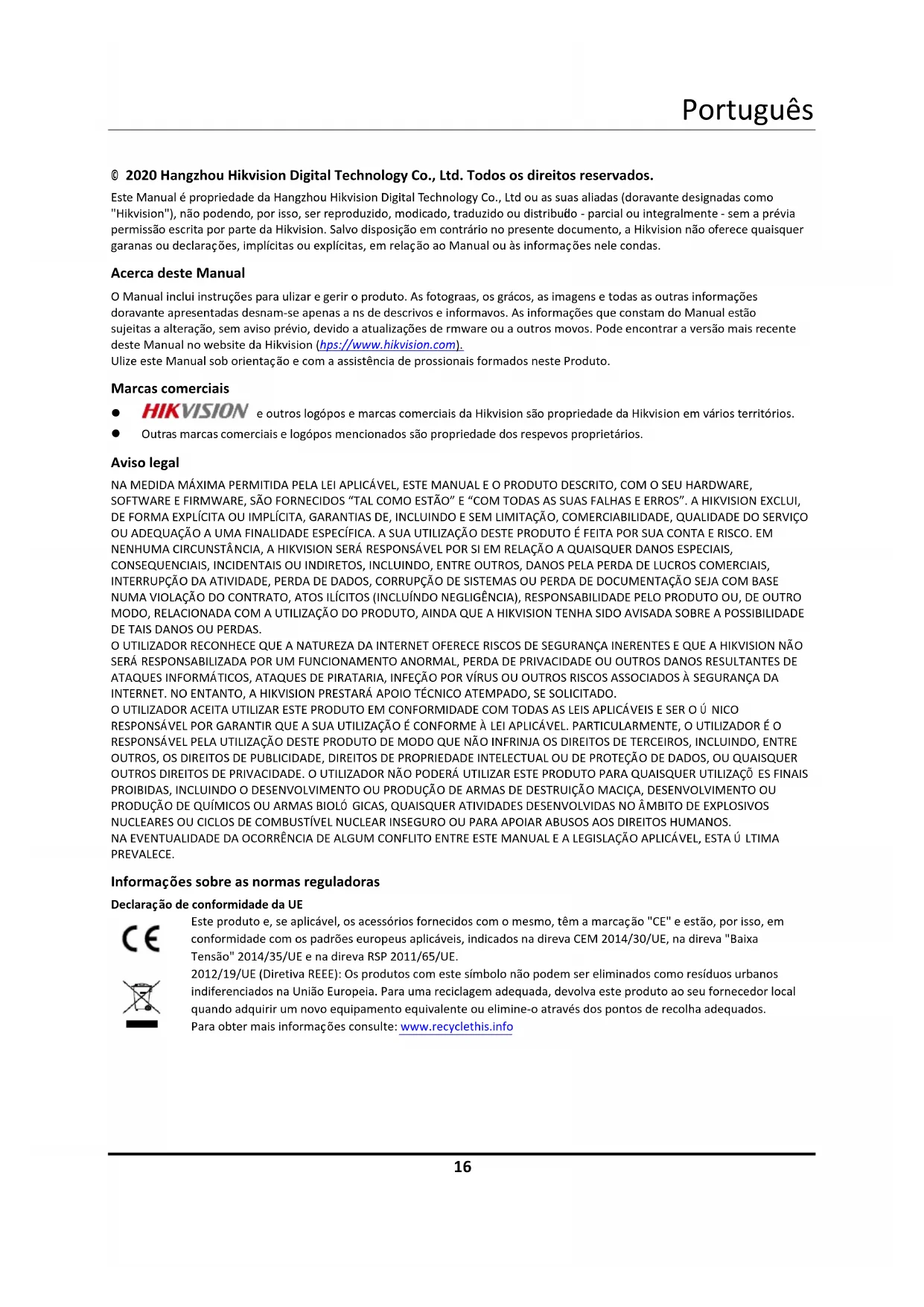 © 2020 Hangzhou Hikvision Digital Technology Co., Ltd. Todos os direitos reservados. Este Manual é propriedade da Hangzhou Hikvision Digital Technology Co., Ltd ou as suas afiliadas (doravante designadas como "Hikvision"), não podendo, por isso, ser reproduzido, modificado, traduzido ou distribuído - parcial ou integralmente - sem a prévia permissão escrita por parte da Hikvision. Salvo disposição em contrário no presente documento, a Hikvision não oferece quaisquer garantias ou declarações, implícitas ou explícitas, em relação ao Manual ou às informações nele contidas. Acerca deste Manual O Manual inclui instruções para utilizar e gerir o produto. As fotografias, os gráficos, as imagens e todas as outras informações doravante apresentadas destinam-se apenas a fins de descritivos e informativos. As informações que constam do Manual estão sujeitas a alteração, sem aviso prévio, devido a atualizações de firmware ou a outros motivos. Pode encontrar a versão mais recente deste Manual no website da Hikvision (https://www.hikvision.com). Utilize este Manual sob orientação e com a assistência de profissionais formados neste Produto. Marcas comerciais e outros logótipos e marcas comerciais da Hikvision são propriedade da Hikvision em vários territórios. Outras marcas comerciais e logótipos mencionados são propriedade dos respetivos proprietários. Aviso legal NA MEDIDA MÁXIMA PERMITIDA PELA LEI APLICÁVEL, ESTE MANUAL E O PRODUTO DESCRITO, COM O SEU HARDWARE, SOFTWARE E FIRMWARE, SÃO FORNECIDOS “TAL COMO ESTÃO” E “COM TODAS AS SUAS FALHAS E ERROS”. A HIKVISION EXCLUI, DE FORMA EXPLÍCITA OU IMPLÍCITA, GARANTIAS DE, INCLUINDO E SEM LIMITAÇÃO, COMERCIABILIDADE, QUALIDADE DO SERVIÇO OU ADEQUAÇÃO A UMA FINALIDADE ESPECÍFICA. A SUA UTILIZAÇÃO DESTE PRODUTO É FEITA POR SUA CONTA E RISCO. EM NENHUMA CIRCUNSTÂNCIA, A HIKVISION SERÁ RESPONSÁVEL POR SI EM RELAÇÃO A QUAISQUER DANOS ESPECIAIS, CONSEQUENCIAIS, INCIDENTAIS OU INDIRETOS, INCLUINDO, ENTRE OUTROS, DANOS PELA PERDA DE LUCROS COMERCIAIS, INTERRUPÇÃO DA ATIVIDADE, PERDA DE DADOS, CORRUPÇÃO DE SISTEMAS OU PERDA DE DOCUMENTAÇÃO SEJA COM BASE NUMA VIOLAÇÃO DO CONTRATO, ATOS ILÍCITOS (INCLUÍNDO NEGLIGÊNCIA), RESPONSABILIDADE PELO PRODUTO OU, DE OUTRO MODO, RELACIONADA COM A UTILIZAÇÃO DO PRODUTO, AINDA QUE A HIKVISION TENHA SIDO AVISADA SOBRE A POSSIBILIDADE DE TAIS DANOS OU PERDAS. O UTILIZADOR RECONHECE QUE A NATUREZA DA INTERNET OFERECE RISCOS DE SEGURANÇA INERENTES E QUE A HIKVISION NÃO SERÁ RESPONSABILIZADA POR UM FUNCIONAMENTO ANORMAL, PERDA DE PRIVACIDADE OU OUTROS DANOS RESULTANTES DE ATAQUES INFORMÁTICOS, ATAQUES DE PIRATARIA, INFEÇÃO POR VÍRUS OU OUTROS RISCOS ASSOCIADOS À SEGURANÇA DA INTERNET. NO ENTANTO, A HIKVISION PRESTARÁ APOIO TÉCNICO ATEMPADO, SE SOLICITADO. O UTILIZADOR ACEITA UTILIZAR ESTE PRODUTO EM CONFORMIDADE COM TODAS AS LEIS APLICÁVEIS E SER O Ú NICO RESPONSÁVEL POR GARANTIR QUE A SUA UTILIZAÇÃO É CONFORME À LEI APLICÁVEL. PARTICULARMENTE, O UTILIZADOR É O RESPONSÁVEL PELA UTILIZAÇÃO DESTE PRODUTO DE MODO QUE NÃO INFRINJA OS DIREITOS DE TERCEIROS, INCLUINDO, ENTRE OUTROS, OS DIREITOS DE PUBLICIDADE, DIREITOS DE PROPRIEDADE INTELECTUAL OU DE PROTEÇÃO DE DADOS, OU QUAISQUER OUTROS DIREITOS DE PRIVACIDADE. O UTILIZADOR NÃO PODERÁ UTILIZAR ESTE PRODUTO PARA QUAISQUER UTILIZAÇÕ ES FINAIS PROIBIDAS, INCLUINDO O DESENVOLVIMENTO OU PRODUÇÃO DE ARMAS DE DESTRUIÇÃO MACIÇA, DESENVOLVIMENTO OU PRODUÇÃO DE QUÍMICOS OU ARMAS BIOLÓ GICAS, QUAISQUER ATIVIDADES DESENVOLVIDAS NO ÂMBITO DE EXPLOSIVOS NUCLEARES OU CICLOS DE COMBUSTÍVEL NUCLEAR INSEGURO OU PARA APOIAR ABUSOS AOS DIREITOS HUMANOS. NA EVENTUALIDADE DA OCORRÊNCIA DE ALGUM CONFLITO ENTRE ESTE MANUAL E A LEGISLAÇÃO APLICÁVEL, ESTA Ú LTIMA PREVALECE. Informações sobre as normas reguladoras Declaração de conformidade da UE