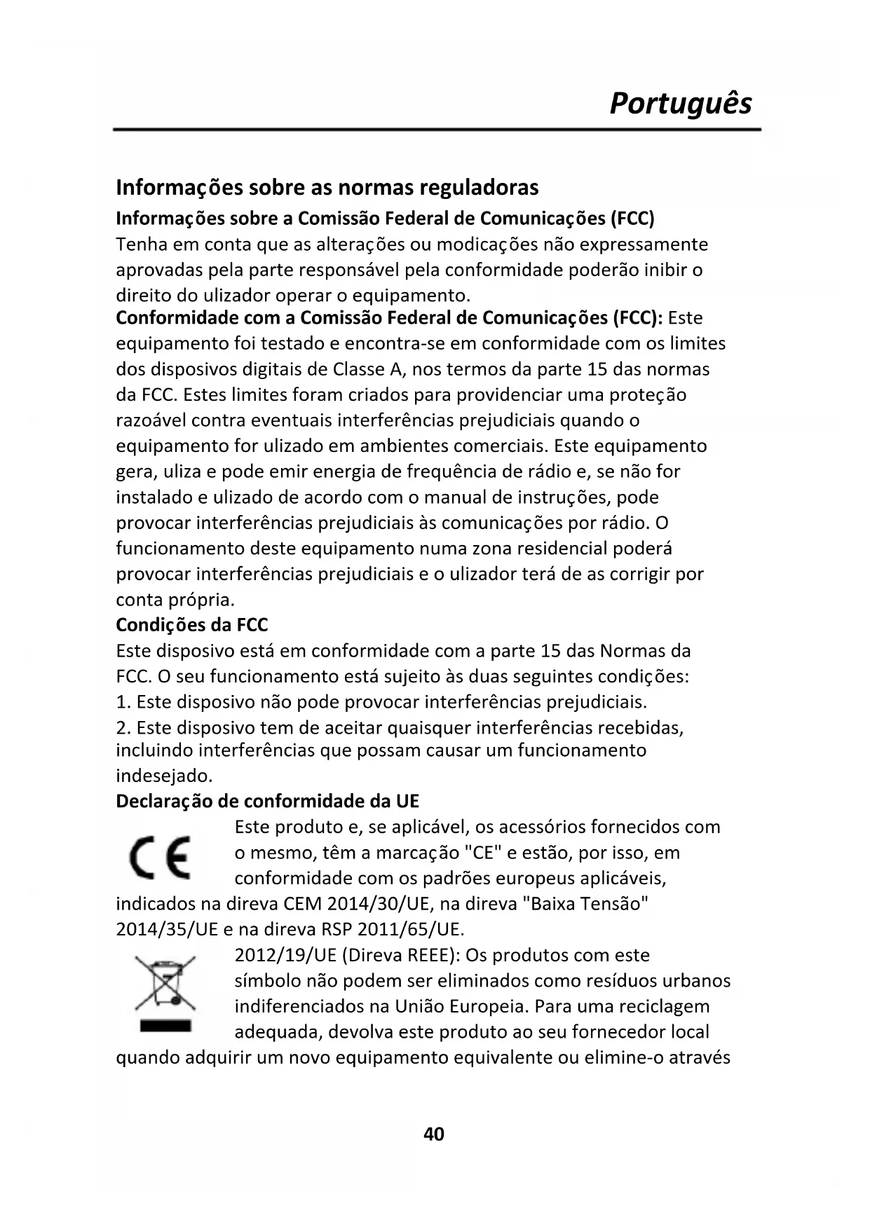 incluindo interferências que possam causar um funcionamento indesejado. Declaração de conformidade da UE Este produto e, se aplicável, os acessórios fornecidos com o mesmo, têm a marcação "CE" e estão, por isso, em conformidade com os padrões europeus aplicáveis, indicados na diretiva CEM 2014/30/UE, na diretiva "Baixa Tensão" 2014/35/UE e na diretiva RSP 2011/65/UE. 2012/19/UE (Diretiva REEE): Os produtos com este símbolo não podem ser eliminados como resíduos urbanos indiferenciados na União Europeia. Para uma reciclagem adequada, devolva este produto ao seu fornecedor local quando adquirir um novo equipamento equivalente ou elimine-o atravésPortuguês