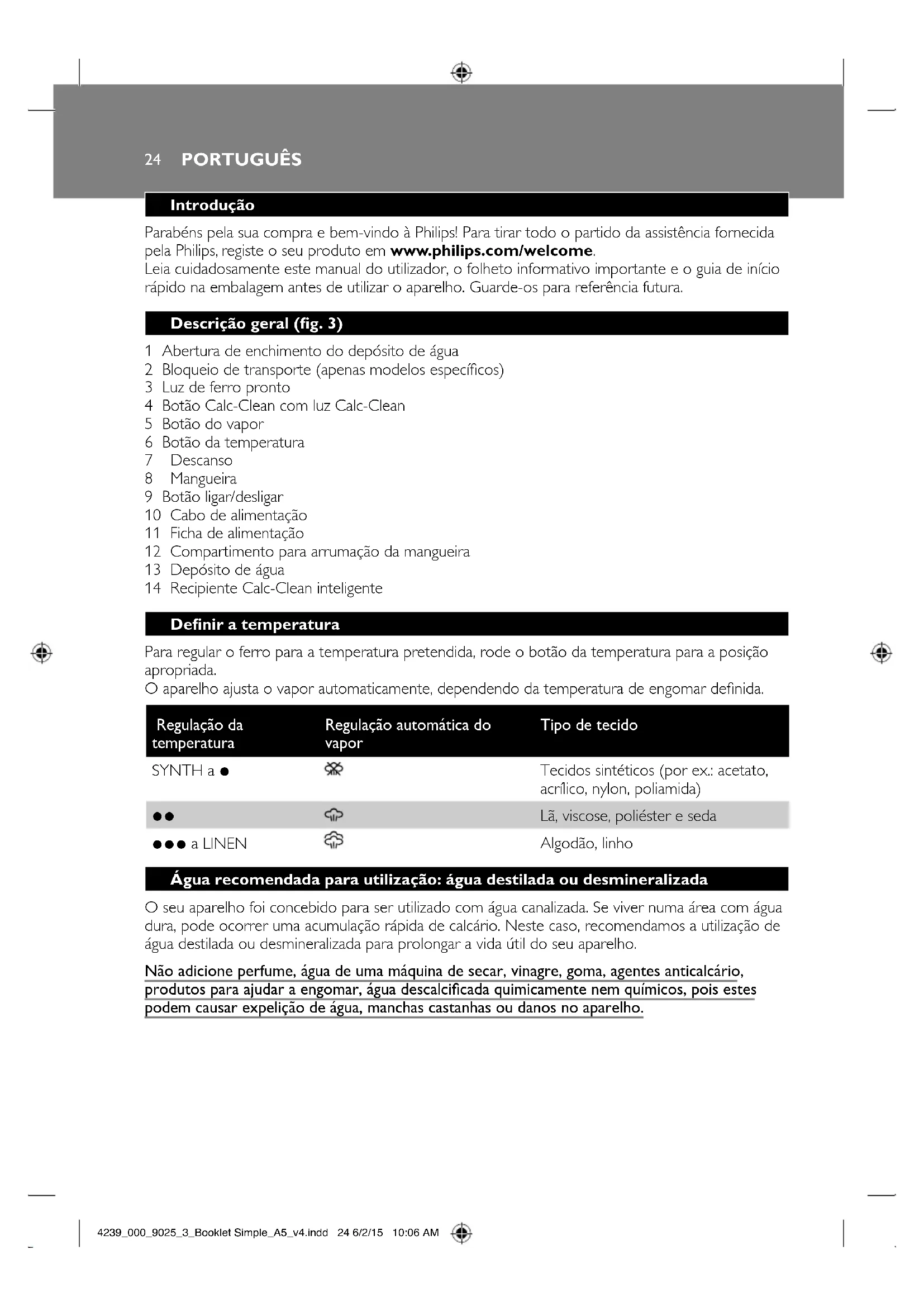 QuandooprocessoCalc-Cleanestiverconcluído,oferropáradeemitirsinaissonoros(g.12). 9 Limpeoferrocomumpanoevolteacolocá-lonaestaçãodebase(g.13). 10 Visto que o recipiente Calc-Clean aquece durante o processo Calc-Clean, aguarde aprox. 5 minutos antes de lhe tocar. 11 Transporte o recipiente Calc-Clean até ao lava-loiça, esvazie-o e guarde-o para utilizaçõesfuturas(g.14). PORTUGUÊS 25 4239_000_9025_3_Booklet Simple_A5_v4.indd 25 6/2/15 10:06 AM12 Se necessário, pode repetir os passos 1 a 11. Assegure-se de que esvazia o recipiente Calc-Clean antes de iniciar o respectivo processo. Nota: Durante o processo Calc-Clean, pode sair água limpa pela base se não houver calcário acumulado dentro do ferro. Isto é normal. Modo de desactivação automática de segurança (apenas em modelos especícos) - Para poupar energia, o gerador de vapor desliga-se automaticamente se não for utilizado durante 15 minutos. A luz de “ferro pronto” ca intermitente. - Para reactivar o gerador de vapor, coloque o botão ligar/desligar na posição para desligar e, em seguida, na posição para ligar. Resolução de problemas Este capítulo resume os problemas mais comuns que podem surgir no aparelho. Se não conseguir resolver o problema com as informações fornecidas a seguir, visite www.philips.com/support para consultar uma lista de perguntas frequentes ou contacte o Centro de Apoio ao Cliente no seu país. Problema Possível causa Solução O ferro não produz vapor. Não existe água suciente no depósito da água. Encha o depósito com água acima da indicação MIN. Mantenha o botão de vapor premido até sair vapor. Pode demorar até 30 segundos para sair vapor. Não premiu o botão de vapor. Mantenha o botão de vapor premido até sair vapor. Deniu o botão da temperatura para 1. Rode o botão da temperatura para 2 ou para um nível mais elevado. A função de vapor foi desactivada até o processo Calc-Clean ser executado. Execute o processo Calc-Clean para restaurar a função de vapor (consulte o capítulo “IMPORTANTE - Limpeza e manutenção”). A luz Calc-Clean ca intermitente e o aparelho emite sinais sonoros. Trata-se do alerta Calc-Clean. Execute o processo Calc-Clean num intervalo de 1 hora depois do alerta Calc-Clean ser emitido. A luz Calc-Clean ca intermitente e/ou o aparelho emite sinais sonoros. Ainda não executou ou não conclui o processo Calc-Clean. Execute o processo Calc-Clean para activar novamente a função de vapor (consulte o capítulo “IMPORTANTE - Limpeza e manutenção”). A luz Calc-Clean ca intermitente e o aparelho emite um sinal sonoro de cada vez que primo o botão de vapor. Não sai vapor da base. Ainda não executou ou não conclui o processo Calc-Clean. Execute o processo Calc-Clean para activar novamente a função de vapor (consulte o capítulo “IMPORTANTE - Limpeza e manutenção”). PORTUGUÊS26 4239_000_9025_3_Booklet Simple_A5_v4.indd 26 6/2/15 10:06 AMProblema Possível causa Solução O aparelho desligou-se. A função de desactivação automática de segurança foi activada, isto acontece automaticamente se o gerador de vapor não for utilizado ou o botão de vapor não foi premido durante mais de 15 minutos. Coloque o botão ligar/desligar na posição para desligar e, em seguida, na posição para ligar. O aparelho produz um som elevado de bombeamento. O depósito de água está vazio. Encha o depósito de água e prima o botão de vapor até o som de bombeamento se tornar mais suave e sair vapor pela base. A base liberta gotas de vapor. Depois do processo Calc- Clean, a água restante pode sair em gotas através da base. Seque a base com um pano. Se a luz Calc- Clean continuar intermitente e o aparelho continuar a emitir sinais sonoros, execute o processo Calc-Clean (consulte o capítulo “IMPORTANTE - Limpeza e manutenção”). O processo Calc-Clean não foi concluído. Tem de executar o processo Calc-Clean novamente (consulte o capítulo “IMPORTANTE - Limpeza e manutenção”). Saem impurezas e água suja da base do ferro. Podem ter-se depositado no depósito do vapor e/ou na base impurezas ou químicos presentes na água. Execute o processo Calc-Clean regularmente (consulte o capítulo “IMPORTANTE - Limpeza e manutenção”). A base liberta água. Iniciou acidentalmente o processo Calc-Clean (consulte o capítulo “IMPORTANTE - Limpeza e manutenção”). Desligue o aparelho. Em seguida, volte a ligá-lo. Rode o botão da temperatura para a regulação da temperatura pretendida, em vez da regulação CALC CLEAN. Deixe o ferro aquecer até a luz de ferro pronto se manter continuamente acesa. O processo Calc- Clean não é iniciado. Não regulou o botão da temperatura para CALC CLEAN ou não aguardou até o ferro aquecer. Consulte o capítulo “IMPORTANTE - Limpeza e manutenção”. Não premiu o botão Calc- Clean durante 2 segundos até o aparelho começar a emitir sinais sonoros. Consulte o capítulo “IMPORTANTE - Limpeza e manutenção”. PORTUGUÊS 27 4239_000_9025_3_Booklet Simple_A5_v4.indd 27 6/2/15 10:06 AM4239_000_9025_3_Booklet Simple_A5_v4.indd 28 6/2/15 10:06 AM4239_000_9025_3_Booklet Simple_A5_v4.indd 29 6/2/15 10:06 AM1 2 4 5