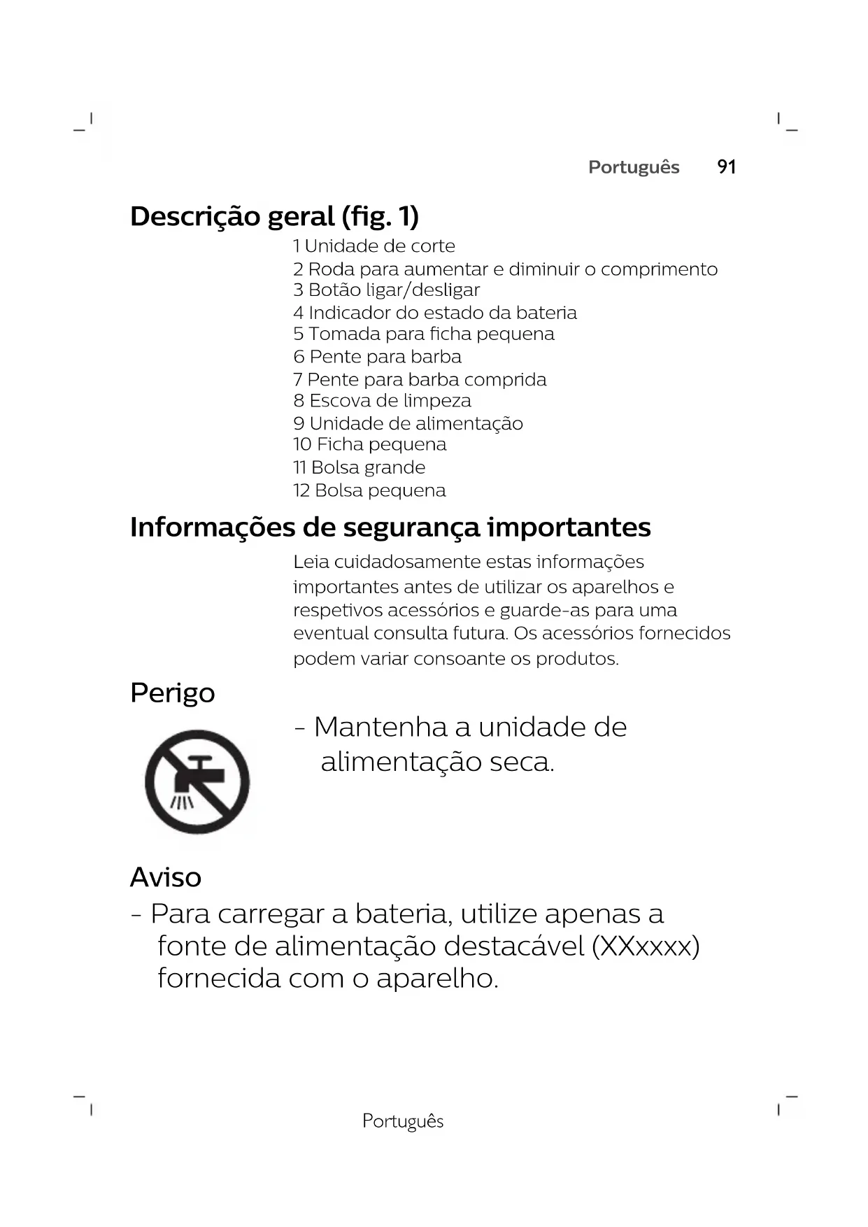 NorskPortuguês Descrição geral (fig. 1) 1 Unidade de corte 2 Roda para aumentar e diminuir o comprimento 3 Botão ligar/desligar 4 Indicador do estado da bateria 5 Tomada para ficha pequena 6 Pente para barba 7 Pente para barba comprida 8 Escova de limpeza 9 Unidade de alimentação 10 Ficha pequena 11 Bolsa grande 12 Bolsa pequena Informações de segurança importantes Leia cuidadosamente estas informações importantes antes de utilizar os aparelhos e respetivos acessórios e guarde-as para uma eventual consulta futura. Os acessórios fornecidos podem variar consoante os produtos. Perigo - Mantenha a unidade de alimentação seca. Aviso - Para carregar a bateria, utilize apenas a fonte de alimentação destacável (XXxxxx) fornecida com o aparelho.